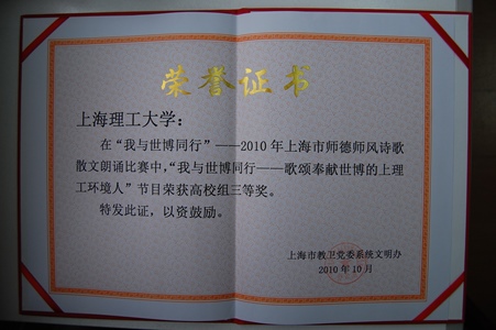 2010“我与世博同行”散文朗诵比赛三等奖