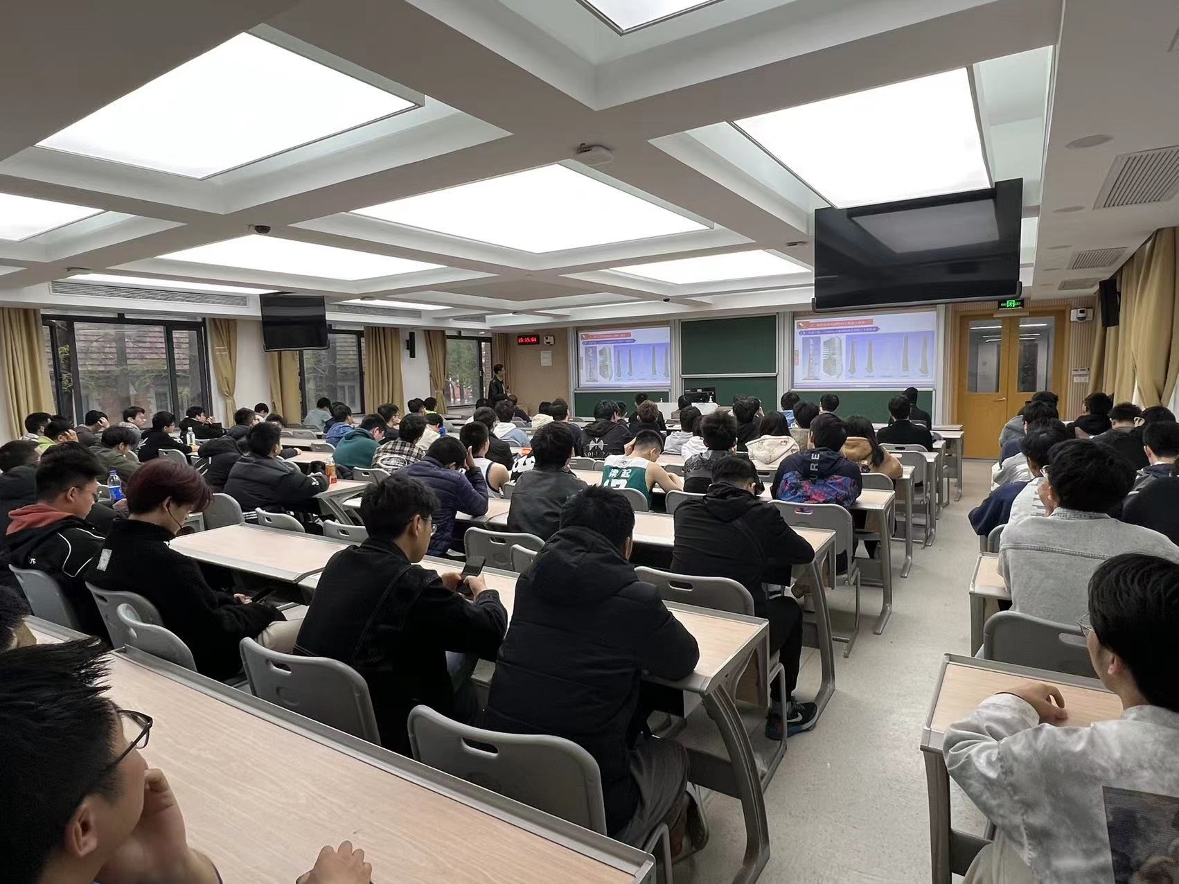 在报告会交流讨论环节,土木工程系师生与贾总就行业智能化发展前景,大型复杂钢结构工程的施工关注要点,本科专业基础与行业发展之间的关系等展开了富有成效的交流与讨论。贾总在交流中强调,迎接土木工程智能化带来的机遇与挑战,土木工程专业师生还是应该牢筑基本功,要深耕理论基础,加强对专业基础知识的学习和应用,专业问题的解决路径和方法需要我们以积极地心态不断探索和总结。