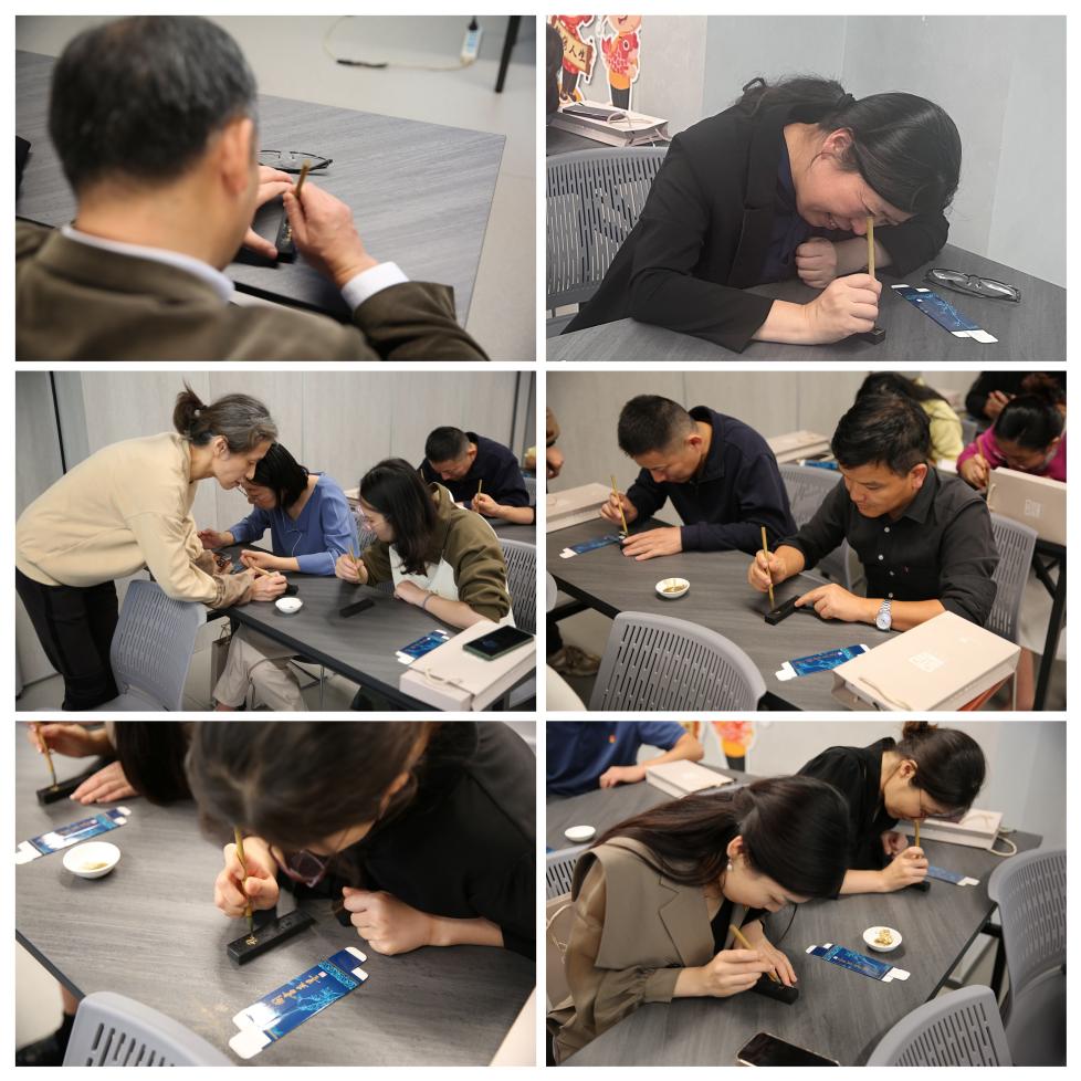 全体人员来到了笔墨工坊大厅,首先观看了《华夏笔墨,千秋传承》裸眼3D影片,感受中国传统文化的魅力。在讲解员的带领下,参观了点烟区域、制墨区域、翻晾区域、描金区域、墨模宝库和上海笔墨博物馆,观摩“最长的狼毫笔”和“最大的如意墨”,现场“直击”非遗技艺,制笔制墨的全流程让党员同志们近距离感受了古老工艺的精妙。除了参观,全体人员还积极参与了非遗技艺的实践课程,在非遗老师的指导下,亲自动手体验传统工艺—墨锭描金,感受非遗技艺的奥妙之处。这独特的体验将金粉与墨锭完美融合,创造出了属于自己独一无二的艺术作品。这一过程不仅让党员同志们领略到了传统工艺的精湛技艺,更激发了他们对传统文化的热爱与探索欲望。