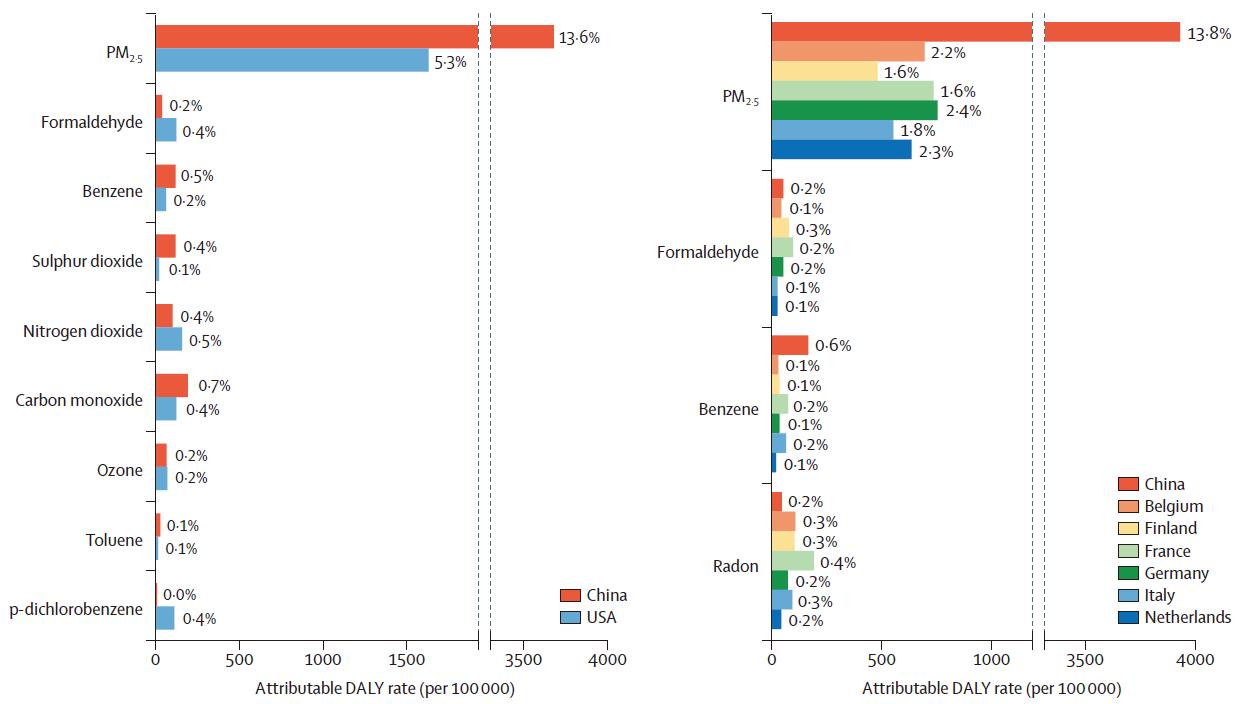 研究发现,从2000年到2017年,中国每10万人室内空气污染造成的疾病负担(DALYs)从4620下降至3700,2017年我国室内空气污染在总疾病负担中占比14.1%,相应经济损失为2.88万亿元,占当年GDP的3.45%,在所有健康风险因素中排名第三;2017年,中国疾病负担排名前十的室内空气污染物为PM2.5、一氧化碳、氡、苯、二氧化氮、臭氧、二氧化硫、甲醛、苯和对二氯苯,与欧美国家的排序差异明显;PM2.5疾病负担占比自2000年至2017年稳居第一;2017年室内空气污染疾病负担比室外空气污染高9.50%;中国每10万人室内空气污染的疾病负担约为美国的2倍、欧洲多国的4~6倍。为此作者指出,我国室内空气污染问题比欧美多国更严重,在室内空气质量控制方面,既要充分借鉴世界卫生组织或发达国家标准,又要充分考虑我国国情和各地区特点,对症下药、因地制宜地控制室内空气污染。