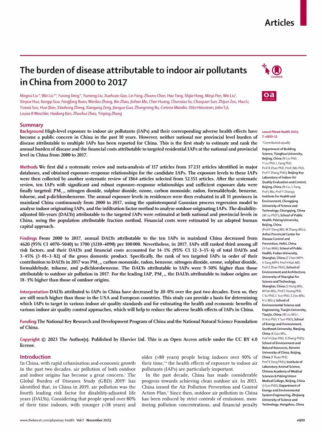 近日,环建学院室内环境与健康团队黄晨,宿春晓,孙婵娟,邹志军,李浩等教师联合国内多个研究团队的最新研究成果,于近日以“中国2000年至2017年室内空气污染归因疾病负担”(The Burden of Disease Attributable to Indoor Air Pollutants in China from 2000 to 2017)为题,发表在医学领域著名期刊《柳叶刀·星球健康》(Lancet Planetary Health)上。研究首次定量评估了中国内地及其31个省级行政区的主要室内空气污染物造成的疾病负担及经济损失,为未来我国室内空气质量相关标准的主控污染物清单及其阈值修订,以及工程控制方略的确定提供了科学支撑和国情依据。该研究是黄晨教授团队在国家科技部重点研发计划等项目和国家自然科学基金项目资助下和清华大学、复旦大学、北京大学等十余所高校研究者通过“医工交叉”合作完成的。