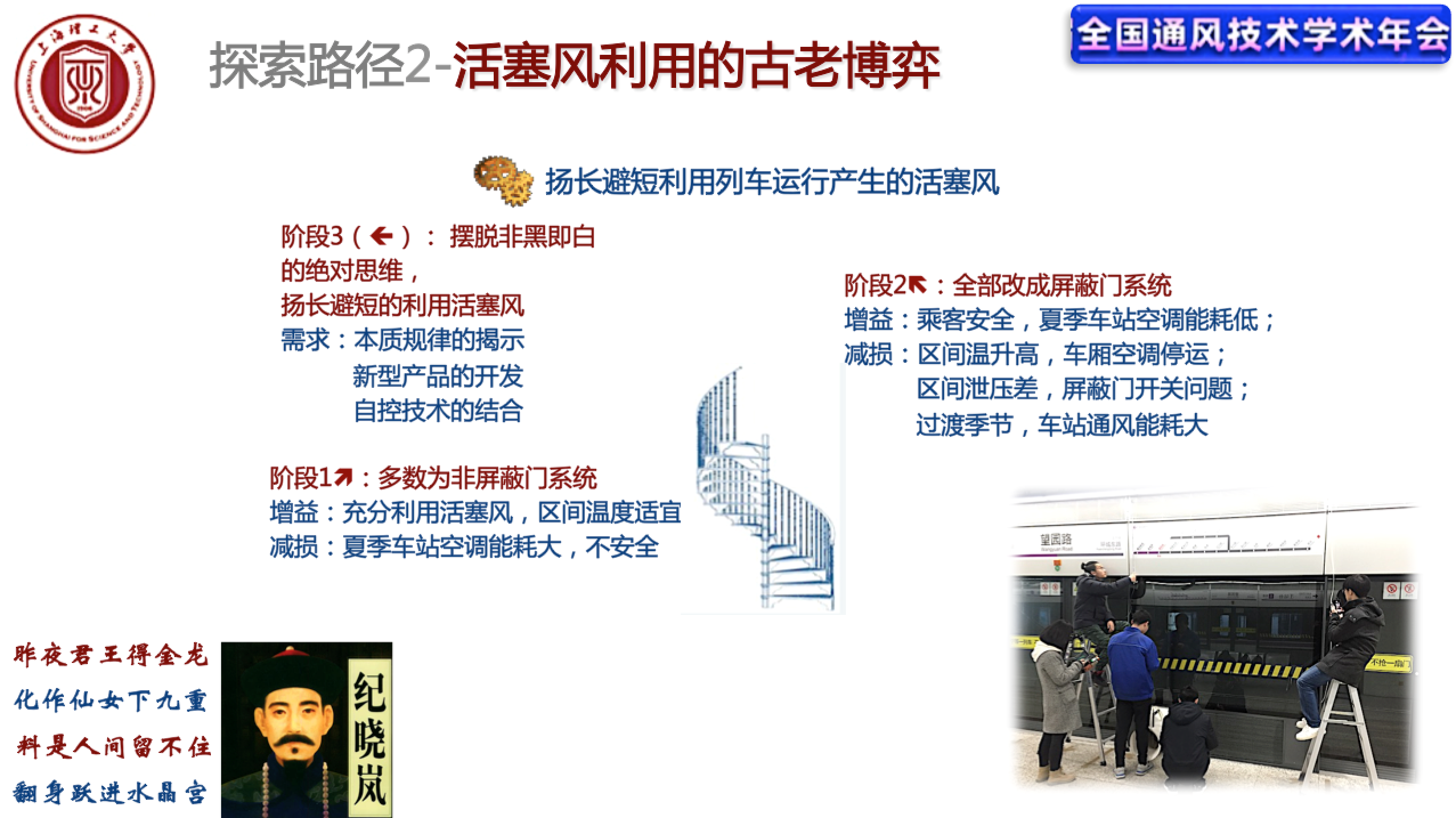 在本届全国通风年会上,王丽慧教授的主旨报告以国家轨道交通行业双碳可持续发展为背景,在介绍上海理工大学和建筑环境与能源应用专业的历史沿革与特色基础上,从“空调季高温天车站降碳可能性”、“过渡季免费活塞风能应用探索”、“区间温升过高‘卡脖子’问题应对”和“不同年限车站环控设备能效优化探索”4个方面介绍了团队的研究结果与心得。该报告主旨明确,论述清晰,语言生动,在会场得到了专委会教授和学者们的认可和高度评价,也进一步增强了上海理工大学的国家一流本科建环专业和上海市教委重点学科暖通学科在全国暖通空调领域、通风领域、地铁热环境领域的学术影响力。