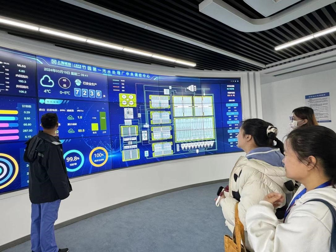 接着,在工作人员的带领下参观了竹园第一污水处理厂的中央调控中心,近距离的感受目前大数据智能化与水污染厂的实时连接,直观地看到水处理各环节各指标的实时变化。