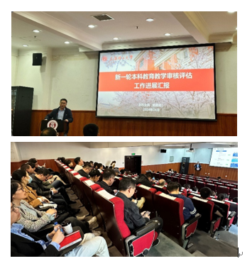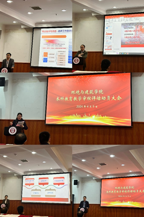 4月9日下午,环境与建筑学院召开本科教育教学审核评估动员大会,全面部署相关工作,学院领导班子全体成员及各系教职工参会。会议旨在激励教职工积极参与本科教育教学审核评估工作,共同推动教学质量提升,助力学院发展迈上新台阶。会议由卢萧书记主持,院长黄远东、副书记曹桂馥、副院长饶平平以及王旭老师分别对学院关于本科教育教学审核评估支撑材料准备、人才培养、教学质量管理体系等方面进行了介绍和相关工作要求。会议还邀请了学院教务处负责人对学校整体本科教育教学审核评估工作进行介绍,对环建学院前期准备工作进行评价和指导。