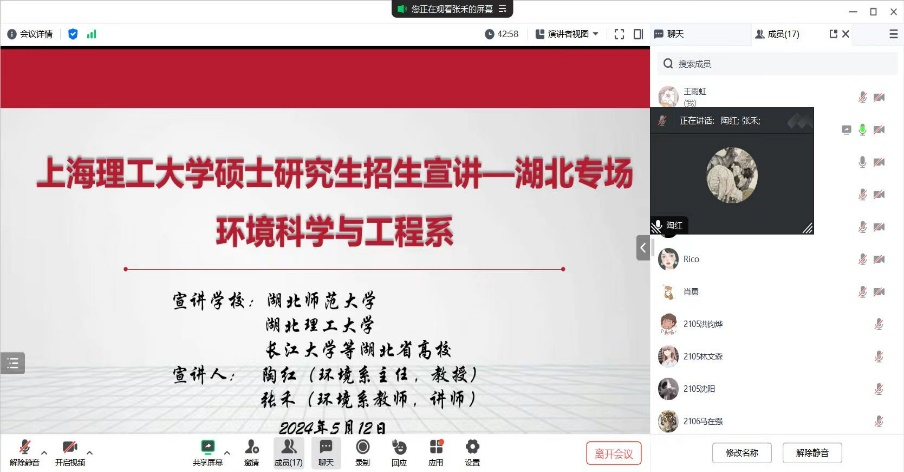 2024年4月起,环境系主任陶红、副系主任徐苏云等人带领招生宣传团队,先后到访上海第二工业大学、上海海事大学、上海工程技术大学3所上海高校开展线下招生宣讲会;5月,以线上宣讲的形式已开展了“湖北专场”、“山东+安徽专场”、“河南专场”三场线上招生宣讲会,吸引了来自湖北师范大学、湖北理工学院、长江大学、河南师范大学、山东理工大学、山东建筑大学、青岛科技大学、菏泽学院等十余所院校的学生参加。