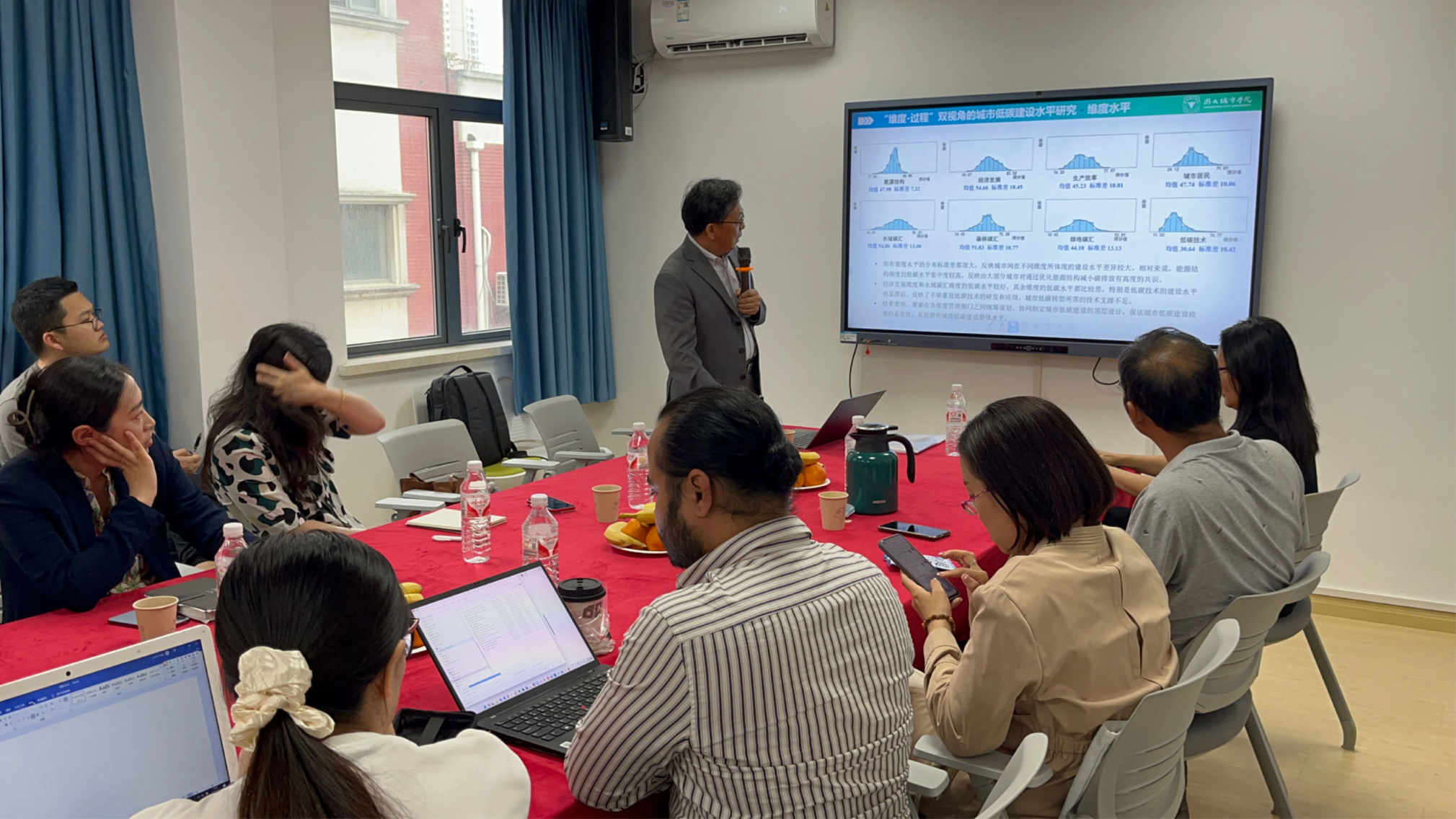 报告首先由申立银教授以“‘维度—过程’双视角的城市低碳建设水平研究”为主题分享最新研究成果。申教授展示了他们团队在全球低碳这一大背景下,基于交叉学科的高效数据收集和处理能力并结合协同理论,表达对建筑业全面低碳管理的见解。