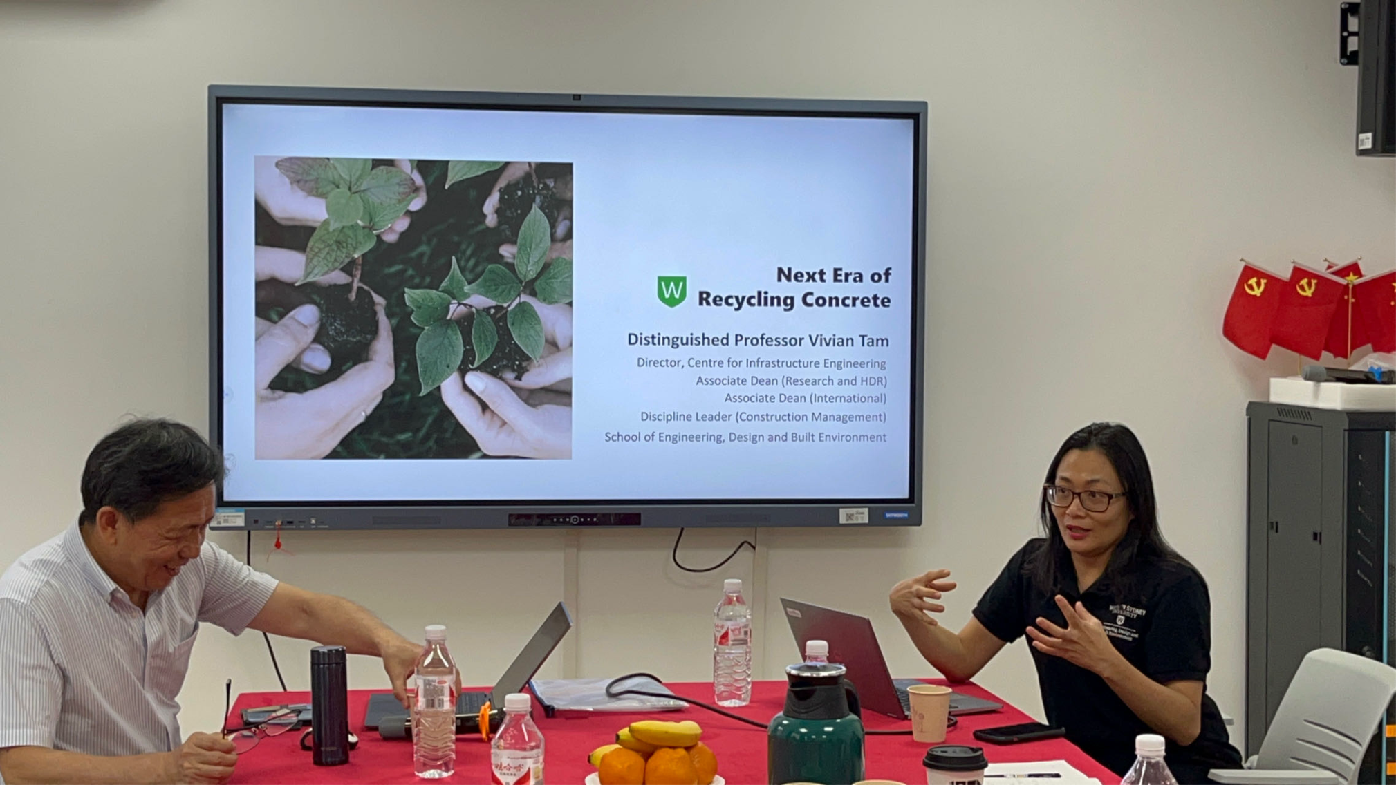 6月5日下午,澳大利亚工程院院士,西悉尼大学工程、设计与建筑环境学院副院长谭颖恩(Vivian W.Y. Tam)教授应环境与建筑学院邀请,在环建学院二号楼205会议室开展以“CO2 Concrete”为主题的学术交流会。同时浙江大学城市学院国土空间规划学院特聘教授申立银作为特邀嘉宾莅临会场并做报告“‘维度—过程’双视角的城市低碳建设水平研究”。土木工程系副教授阚黎黎、孙畅、迟琳和环境科学与工程系黄蓓佳教授参加了本次交流会,土木工程系刘琼老师主持。