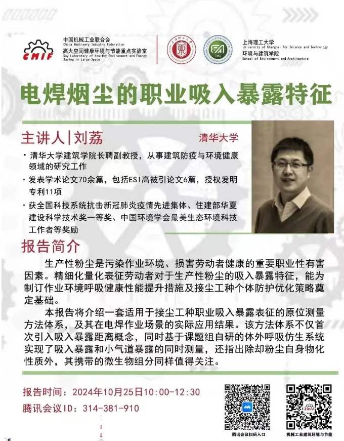 为进一步增强对职业暴露于生产性粉尘中劳动者面临的健康风险的认识,了解目前职业暴露监测的研究进展,提升对职业暴露风险的重视,中国机械工业联合会、上海理工大学环境与建筑学院高大空间健康环境与节能重点实验室将于线上举办主题为“电焊烟尘的职业吸入暴露特征”的学术报告。