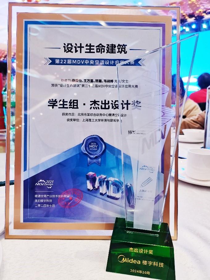 第二十二届MDV中央空调设计应用大赛颁奖典礼于10月22号在浙江省湖州市隆重举行。上海理工大学建筑环境与能源应用工程专业本科生杨采怡、王万里、陈露、韦诗婷组成的参赛团队,在林尧林、李奕霖、王昕三位老师的悉心指导下,以《北京市某综合政务中心暖通空调设计》为参赛作品,荣获杰出设计奖(排名第一)。林尧林、李奕霖、王昕获得杰出指导老师奖。