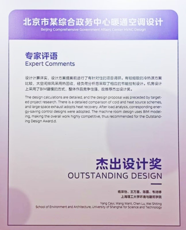 同学和老师们的不懈努力和创新设计,使得上海理工大学的参赛作品在众多优秀作品中脱颖而出,赢得了评委的高度认可。这一奖项不仅是对我校教育教学成果的展示,也是对我校学子创新能力和实践精神的赞誉。团队的成功不仅展现了上海理工大学在培养高素质暖通空调设计人才方面的专业实力,也体现了我校在推动学术研究与实践应用相结合的教育方针。期待我校学子在未来的学术和职业生涯中,继续以创新的思维和扎实的专业知识,为社会的发展贡献力量。