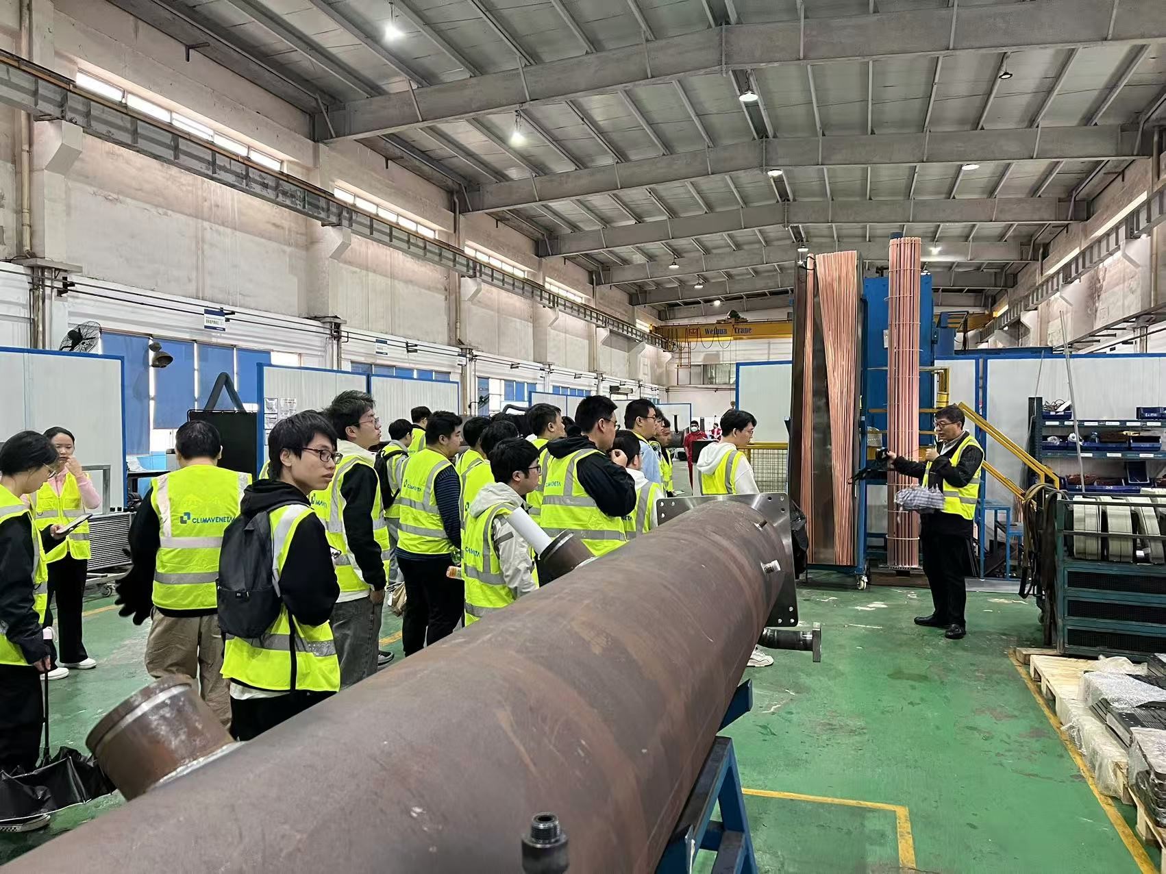 在克莱门特公司,工程师带领同学们参观了多个生产车间和展厅,学习了风冷热泵机组、水冷冷水机组、制冷组件及空调末端设备的生产与制作,并了解了克莱门特的空调设备智能化控制系统。