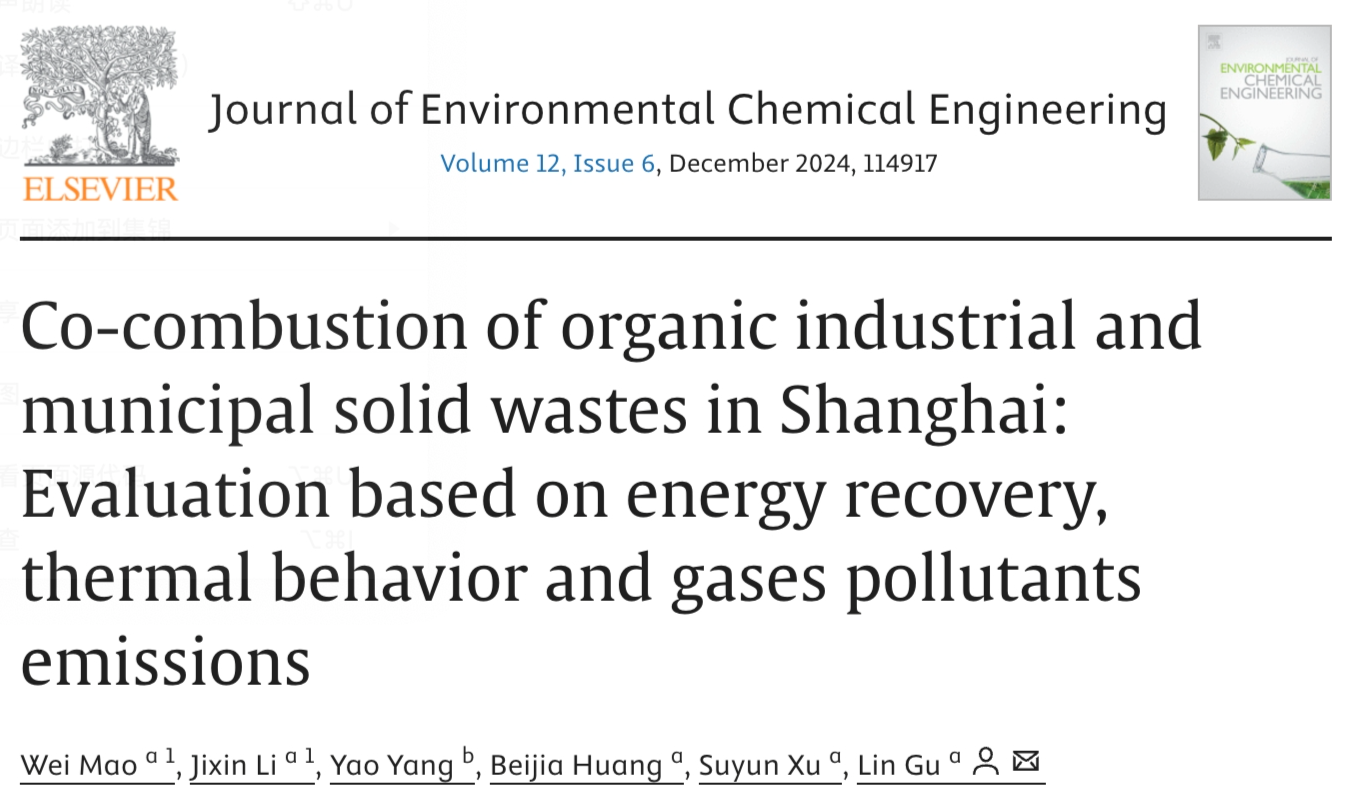 近日,环境与建筑学院2021级本科生毛炜在学院谷麟副教授的指导下,于环境科学领域国际著名期刊《环境化学工程学报》(Journal of Environmental Chemical Engineering,中科院二区top,IF= 7.4)上发表了以“上海市有机工业与城市生活垃圾混烧:基于能量回收、热行为和气体污染物排放的评价”(Co-combustion of organic industrial and municipal solid wastes in Shanghai: evaluation based on energy recovery, thermal behavior and gases pollutants emissions)为题的学术论文。该论文以上海理工大学为完成单位,毛炜为论文的第一作者,谷麟为论文的通讯作者,硕士研究生李吉鑫、杨耀以及环建学院黄蓓佳和徐苏云教授为共同作者。