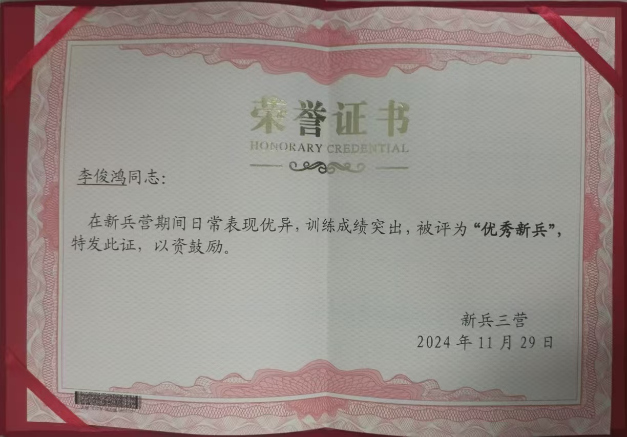 踏入新兵营的第一天起,李俊鸿就展现出了不同凡响的毅力和决心。面对高强度的体能训练、严格的军事纪律和复杂的专业技能学习,他从不言苦,不言累。在战术训练中,他反复练习,力求动作精准到位;在理论学习上,他利用业余时间加餐,不断提升自己的军事素养。经过数月的刻苦训练与不懈努力,李俊鸿在新兵结业考核中取得了优异成绩,不仅在体能、技能等多个项目中名列前茅,更以其良好的团队协作精神和高度的责任感,赢得了领导和战友的一致好评。最终,在新兵总结表彰大会上,李俊鸿荣获新兵营“优秀新兵”称号。站在新的起点上,李俊鸿深知荣誉属于过去,未来的路还很长。他表示,将以此次获奖为契机,继续发扬“特别能吃苦、特别能战斗、特别能奉献”的军人精神,不断提升自我,努力成为军队现代化建设中的中坚力量。同时,他也希望用自己的经历激励更多有志青年投身国防事业,共同为实现中国梦、强军梦贡献青春和力量。