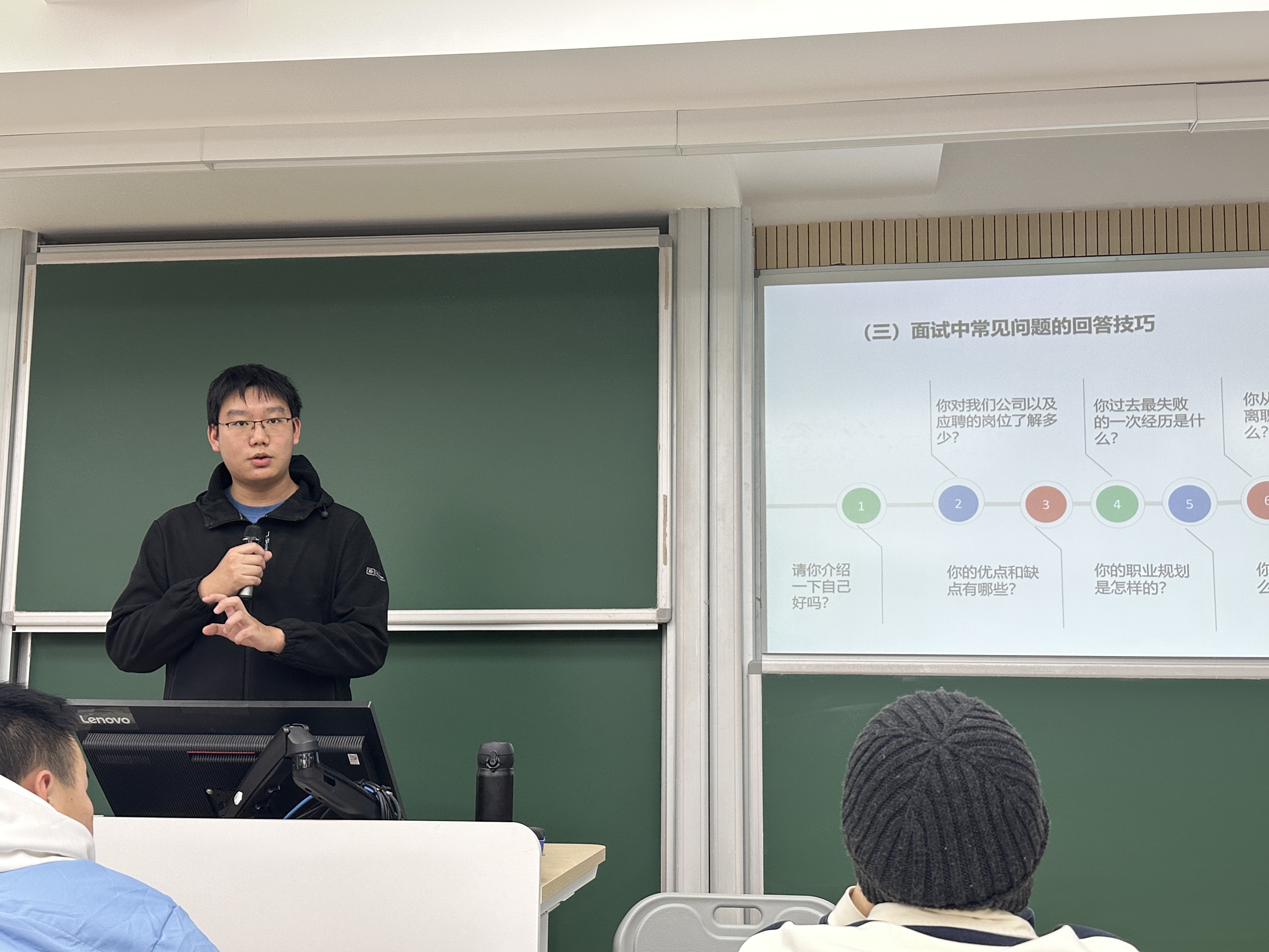 签约学生代表刘元科、孙诚成同学,准备了详实的课件,生动地分享了自身在求职、面试、选offer的干货和心得,并整理出就业实战中的技巧和思路。与会学生分别从应届生身份、面试应对、三方违约等问题,开展热烈互动。