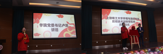 活动伊始,党委书记卢萧和教授陈宝明共同为上海理工大学环境与建筑学院双碳技术研究所揭牌。随后,卢萧书记发表讲话。她认为,在二十届三中全会思想的指引下,过去一年学院教师克服重重困难,砥砺奋进,在教学、科研、社会服务等诸多方面取得了优异成绩,助力学院各项工作的顺利开展。同时,也送上新春祝福,祝愿每位正在努力前行的教师,都能在新的一年披荆斩棘,成长为更好的自己!
