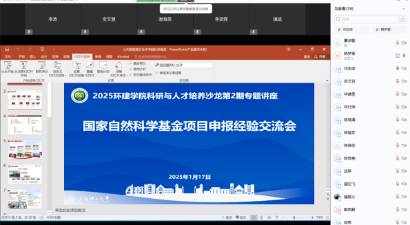 为助力教师提升国家自然科学基金申报质量,环境与建筑学院于1月16日和1月17日举办了2025年国家自然科学基金申报经验分享科研沙龙,线上线下近200位师生参与。本次沙龙由科研副院长王丽慧主持。