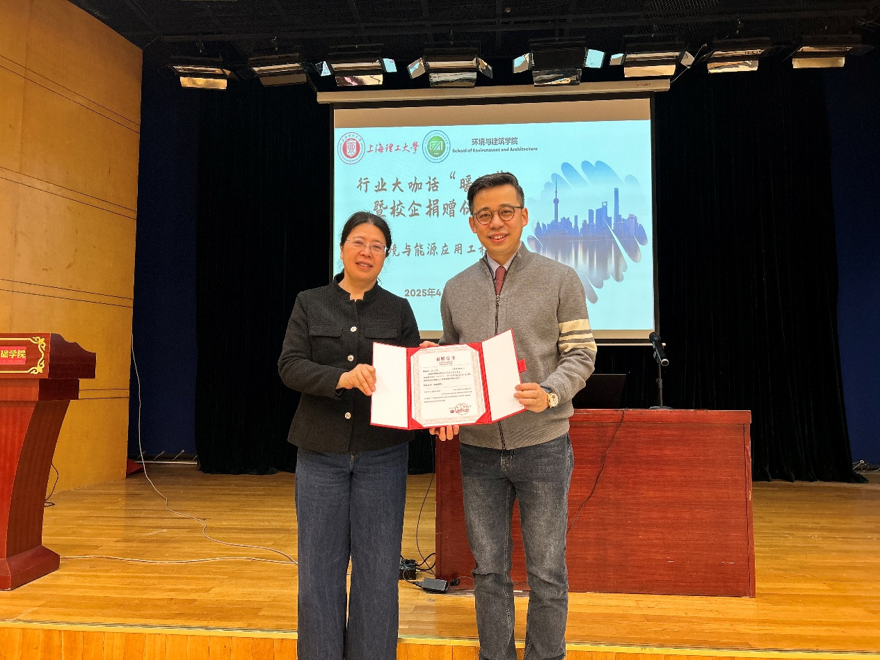 本次活动由学院党委副书记周蓉主持。党委书记卢萧代表学院致辞,指出“建筑环境与能源应用工程专业作为国家级一流本科专业建设点,始终秉承‘立足上海、服务行业、国际接轨’的办学理念。她代表学院感谢张振军校友的慷慨捐赠,优秀校友为母校捐赠奖助学金彰显了上理人饮水思源、回馈社会的责任担当。”卢萧书记代表学院向张振军颁发捐赠证书。作为暖通专业97级校友,张振军先生以个人名义设立专项基金,重点支持建筑环境与能源应用工程专业的人才培养、科技创新与产学研合作。
