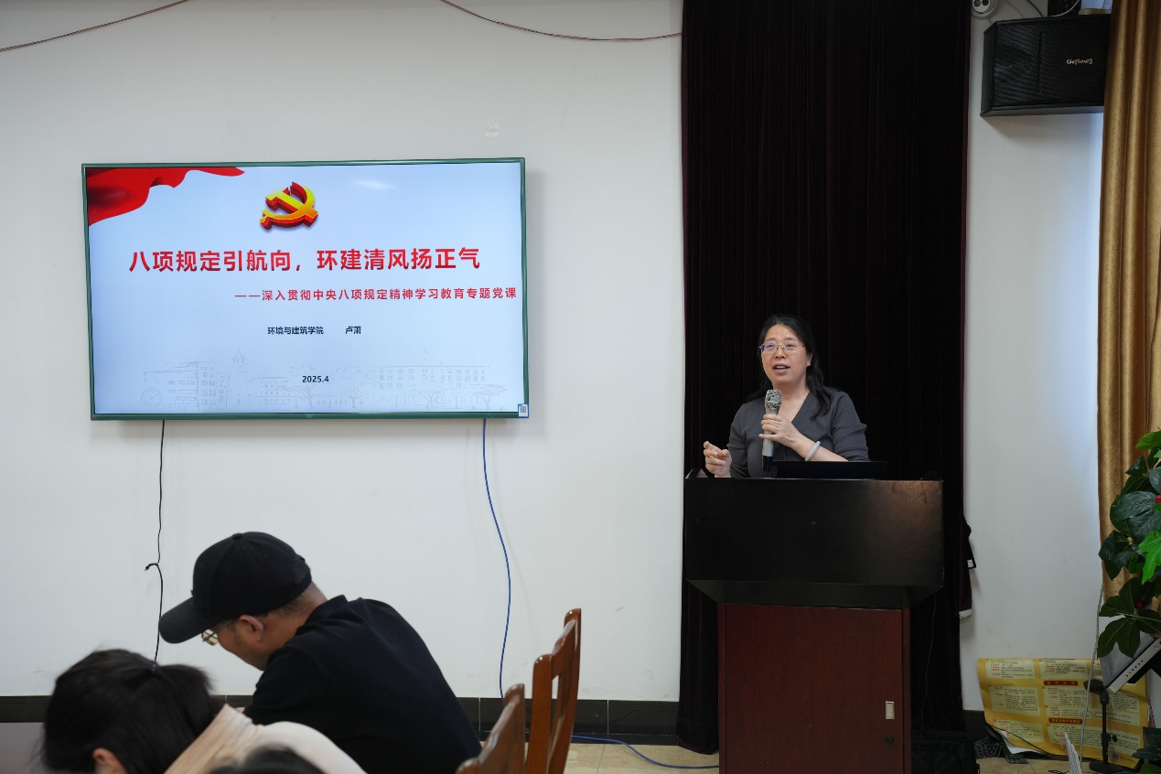 随后,学院党委书记卢萧以《八项规定引航向,环建清风扬正气》就《习近平关于加强党的作风建设论述摘编》第二专题“作风问题本质上是党性问题”开展深入贯彻中央八项规定精神学习教育专题党课。卢萧结合身边的案例对学习教育的主要内容和精神实质、落实举措等进行了解读,引导与会党员要增强党性修养、通过加强作风建设锤炼党性,以优秀的教风不断促进学院学风建设,以优良的作风落实学校第九次党代会精神。
