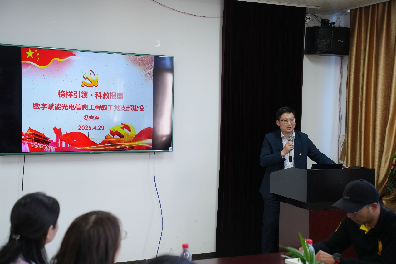 会上,首批全国高校“双带头人”教师党支部书记“强国行”专项行动团队光电信息工程教工党支部书记冯吉军作《榜样引领,科教报国——数字赋能光电信息工程教工党支部建设》专题报告,为学院“双带头人”在数字技术赋能的大环境下,如何在高等教育综合改革中,用好数字技术,更好地发挥党建引领学科建设和教学科研,同时抓好作风建设,为实现学校第九次党代会目标任务发挥好支部战斗堡垒作用。