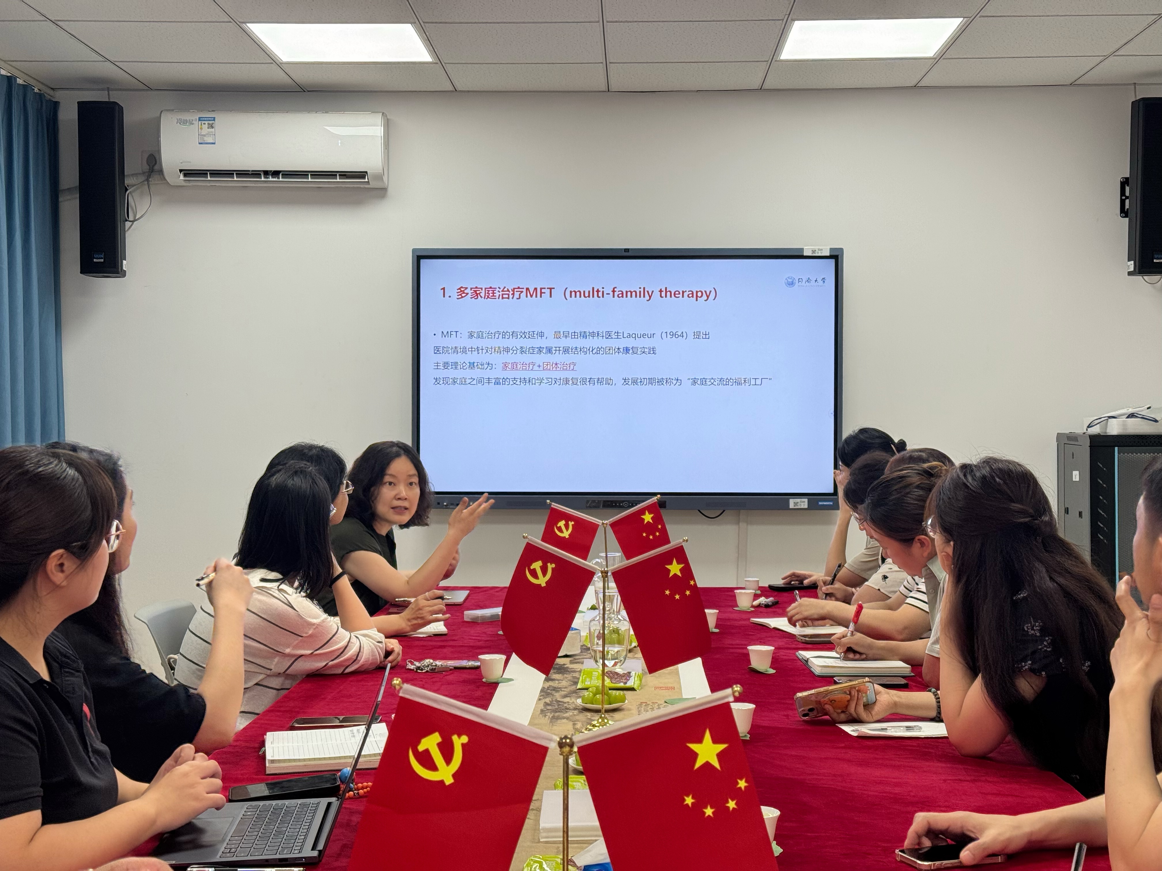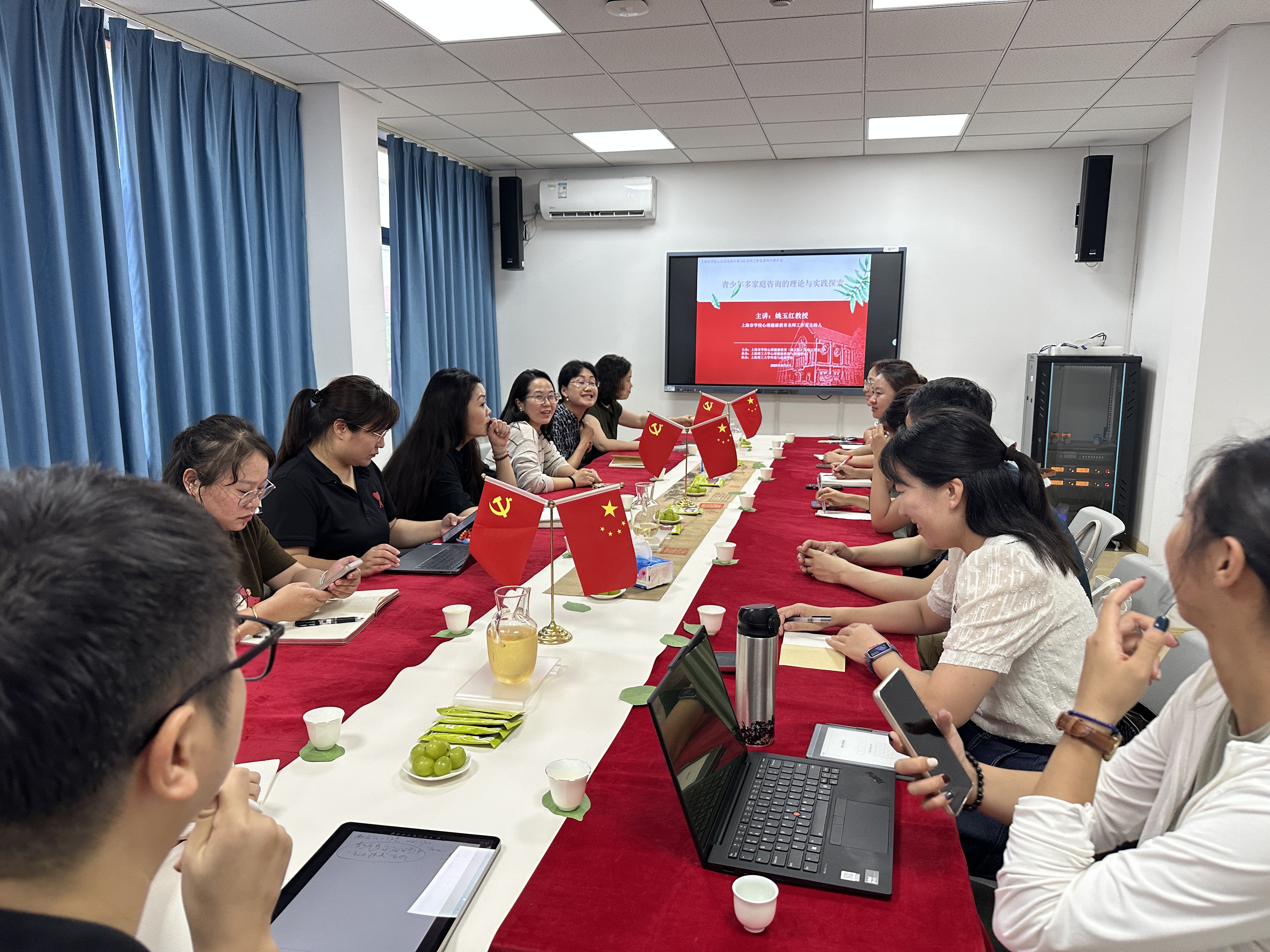 9月4日下午,以“青少年多家庭咨询的理论与实践探索”为主题的茶文化心理沙龙,于上海理工大学环境与建筑学院2号楼205室顺利举办。本期沙龙由上海市学校心理健康教育姚玉红名师工作室主办,环境与建筑学院土木专业研究生党支部、学院心理分中心承办。环境与建筑学院党委副书记周蓉、学校心理健康教育与咨询中心主任杨颎、校心理专兼职老师、学院党支部师生、工作室全体成员一同参与了学习交流。沙龙以红色茶席拉开帷幕,党支部副书记、名师工作室成员王木子老师带领大家开展茶心冥想,以茶联结身心、激发家国情怀,实现“小我”融入“大我”的精神升华。