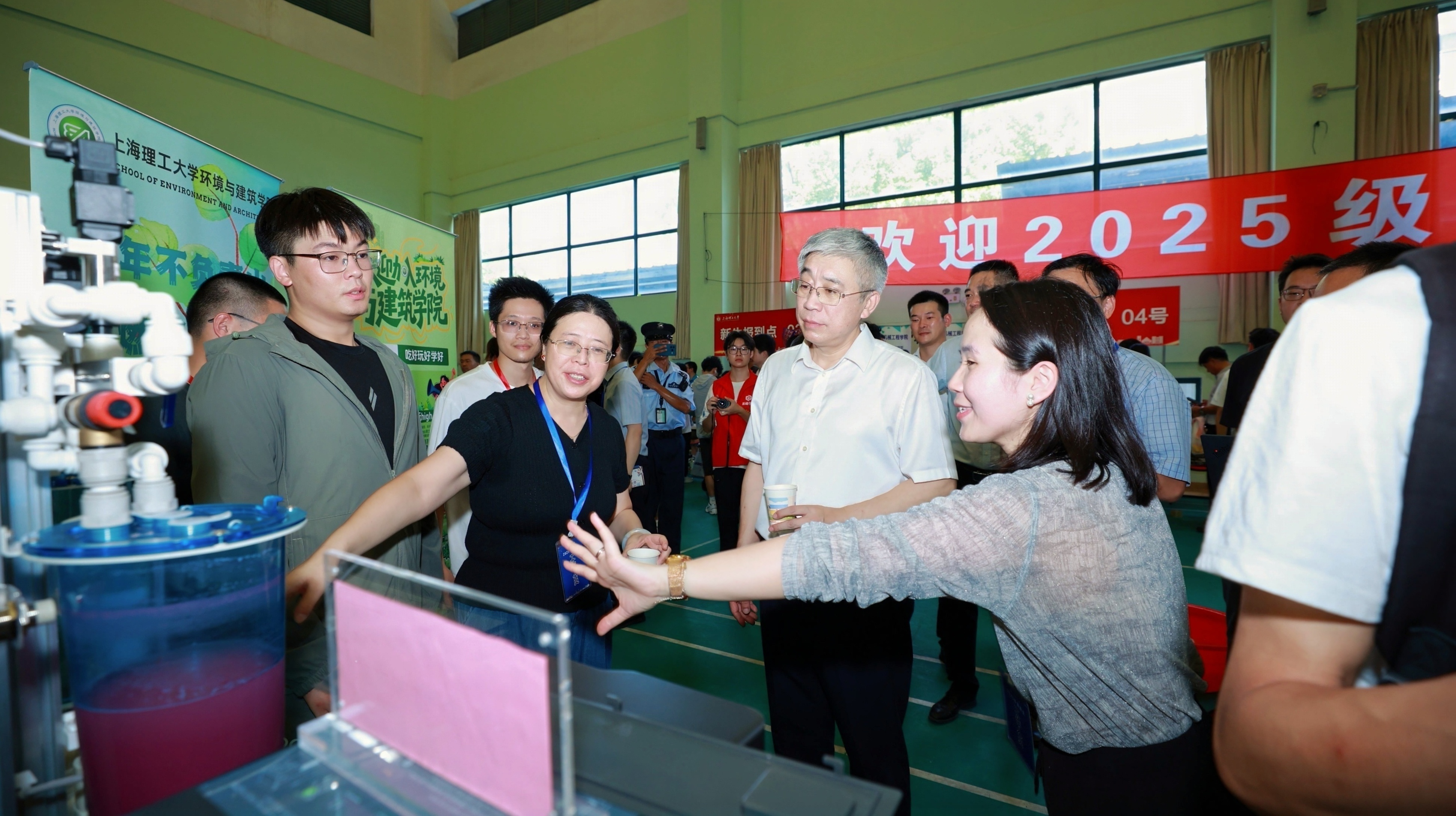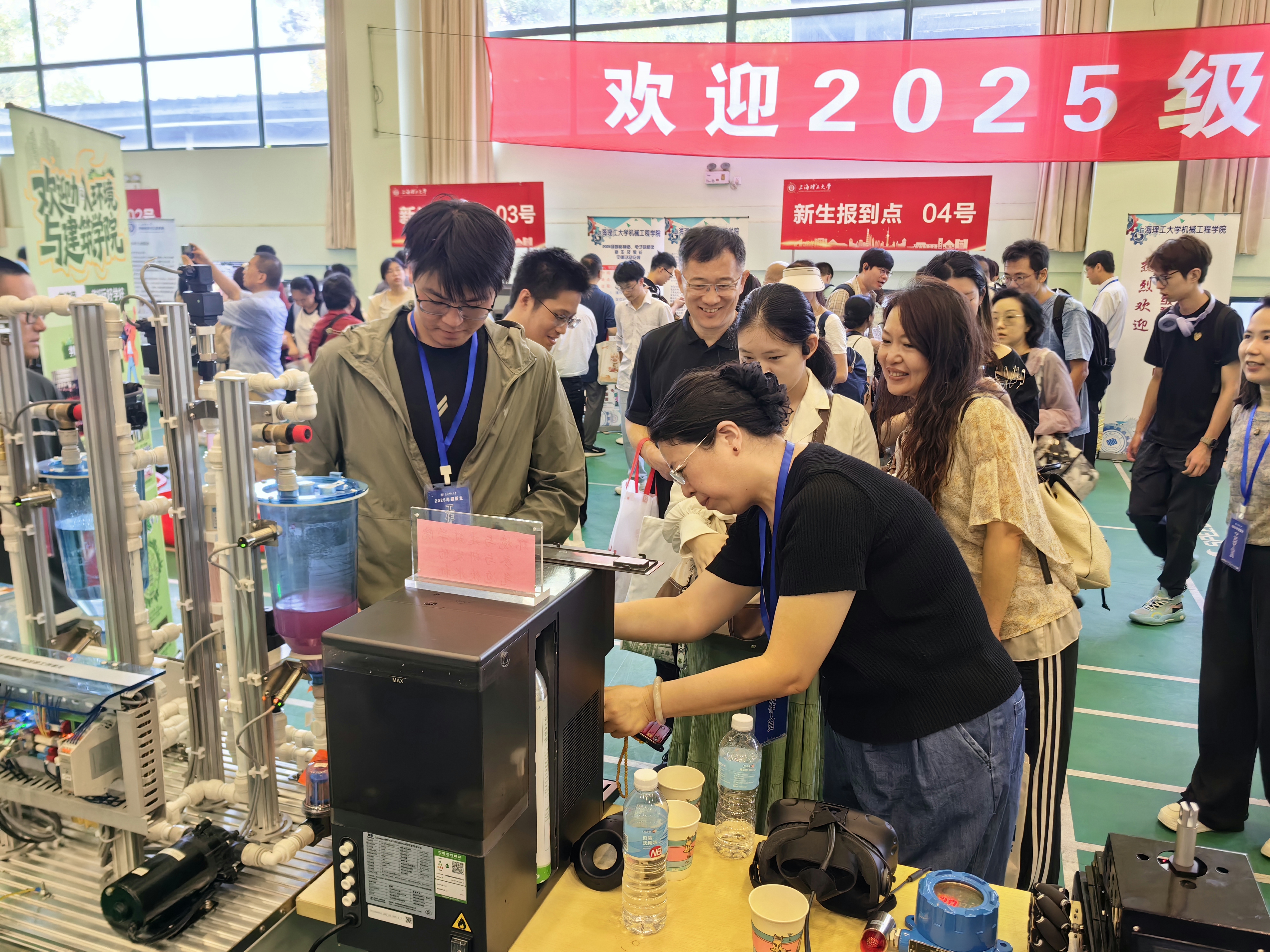 在专业介绍展位,新生们和家长讨论着第一次喝到环建学院研发的气泡水机器制作的饮品,清爽中带点小刺激,这杯水连气弹都是食品级二氧化碳,喝起来更安心。不少新生及家长们被环境专业的污水处理装置所吸引,围聚在动态演示的污水处理装置前,装置旁的交互屏幕实时显示着处理数据。李飞鹏老师正讲解污水净化原理:从混凝沉淀到膜过滤,每一道工序都通过管道直观呈现。