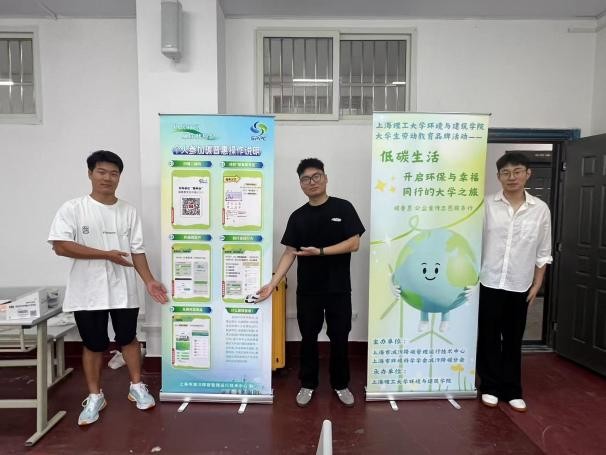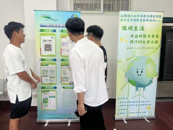 迎新报道现场,上海理工大学环境与建筑学院联合上海环境学会、减污降碳中心在新生迎新中融入大学生劳动教育品牌活动——碳普惠教育,旨在通过专业教育与低碳实践相结合,为“双碳”目标培养具有生态文明素养的新时代环境人才。