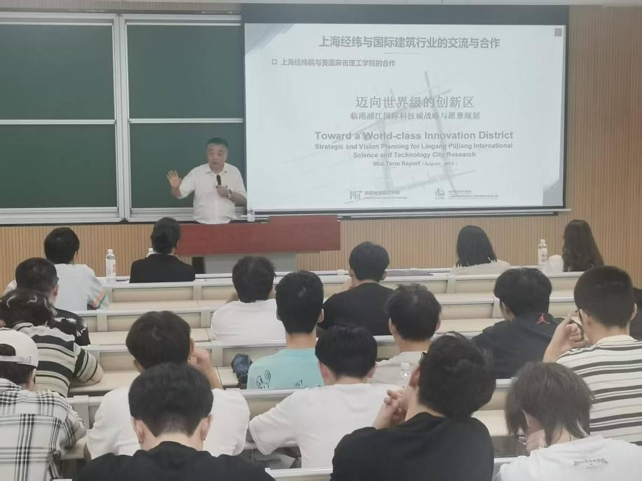 作为深耕土木建筑行业三十余年的资深专家,叶松青董事长围绕“个人职业成长与企业发展历程”“国际合作实践与行业前沿洞察”“直面行业转型挑战与机遇”三大维度分享。他从1986年赴深圳参与机电部深圳设计研究院项目的“拓荒经历”说起,回顾亲历深圳火车站、海王大厦等项目时“一年工作量抵上海四年”的积累,以及1992年借邓小平南巡东风回沪创业,带领2人团队将经纬集团打造成国内首批拥有城乡规划、建筑工程、风景园林“三甲”资质民营设计企业的历程,让学子感受行业与个人成长的关联。在国际视野与行业创新板块,他介绍经纬集团全球化布局:2010 年在美成立全资子公司,2018年起与MIT合作推进规划项目,此前还与美方事务所合作完成上海锦江饭店锦楠楼、世博会世博村设计;同时分享企业响应“一带一路”倡议,为柬埔寨提供技术方案、承接商务部国际官员研修班培训等成果,让学子直观了解行业国际合作的广度与深度。