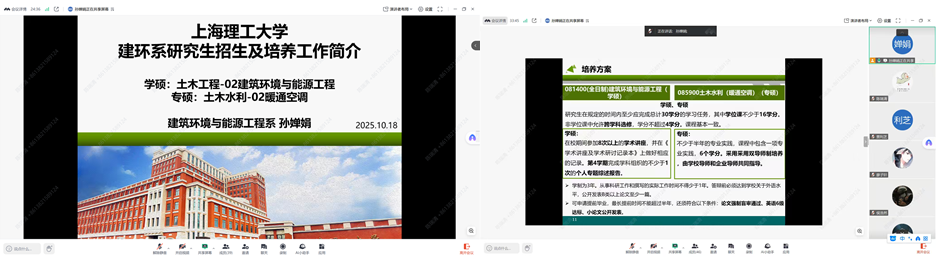 2025年10月20日,在建环系资深教师吕静老师的对接和支持下,环境与建筑学院建环系孙婵娟老师面向青岛滨海学院进行线上研究生招生宣讲会。孙婵娟老师介绍了建环系的学科特色和办学优势、招生政策、师资力量和就业发展方向等。