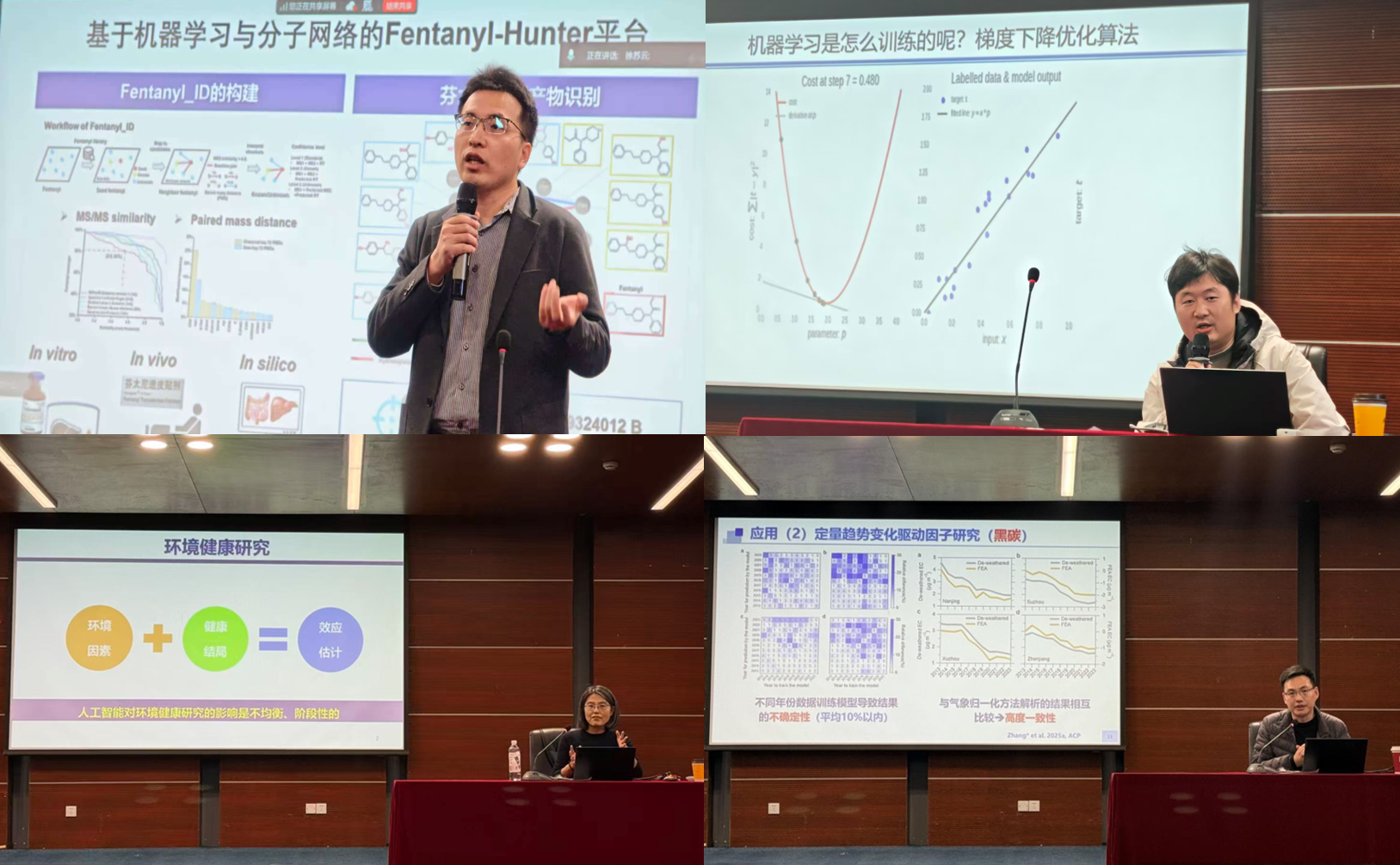 本次研修班特邀多位在AI与生态环境交叉研究领域具有深厚学术积淀和丰硕研究成果的专家学者,围绕多个前沿方向开展专题报告与实操分享,内容涵盖理论研究、技术应用、工具实操等多个维度。其中,复旦大学方明亮教授以“AI在环境健康中的应用:从物质识别到毒性评估与绿色化学” 为题,通过质谱数据分析、毒性预测模型构建等案例,剖析AI在污染物识别、健康风险评估等领域的优势,提出“数据驱动+知识引导”的科研融合思维;日本东北大学李昊教授线上分享“数字材料生态:AI+材料的数字平台驱动闭环框架”,阐述环境功能材料研发从“试错法”到“理性设计”的范式转变路径;同济大学钟士发教授从机器学习原理、模型训练与评估入手,结合污染物预测等案例,演示其在环境科研中的应用,并建议科研工作者立足科学问题、善用开源数据;复旦大学孟夏教授聚焦“人工智能在环境健康研究中的应用”,通过复杂暴露与健康关联性挖掘等案例,探讨领域发展机遇与挑战;南京信息工程大学张运江教授以“人工智能在大气环境观测数据解析中的应用”为题,分享AI在数据重建、污染源解析等方面的研究成果,彰显其挖掘环境数据价值的独特作用;复旦大学陶辰亮博士后则开展“手把手”实操教学,系统梳理Python科学计算与机器学习工具库,现场演示从环境搭建到结果可视化的完整流程,有效降低入门AI技术的门槛。