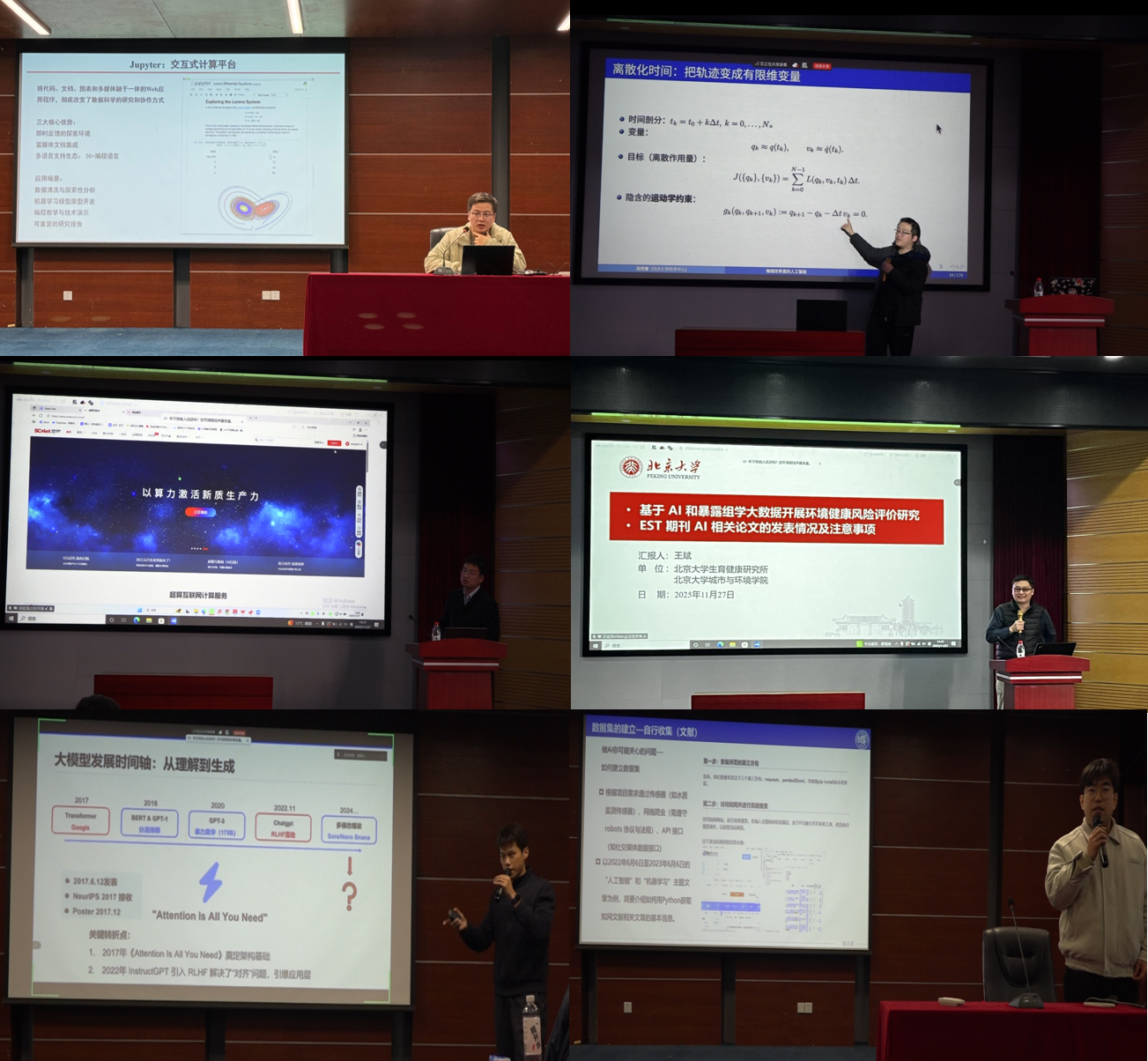 此外,研修班还设置了多个专题分享环节,内容覆盖跨学科研究、战略决策、算力支撑、论文发表等多个维度。南京大学钱超教授作“人工智能跨学科交叉研究初探”报告,展示了AI技术在不同学科领域的创新应用模式与研究成果;同济大学冯恺睿研究员介绍了AI技术在应对气候变化、优化环境治理策略中的核心作用;中科曙光邓密海副经理分享了曙光服务器使用经验与国产算力发展现状,为科研工作者提供了算力支撑解决方案;北京大学王斌教授围绕“基于AI和暴露组学大数据开展环境健康风险评价研究”主题,深入分析了EST期刊AI相关论文的发表趋势、选题方向与写作注意事项;复旦大学王以恒、贠金虎博士研究生结合自身科研实践,分享了“AI辅助科研的个人经验与实操技巧”,为科研人员提供了宝贵的实践参考。