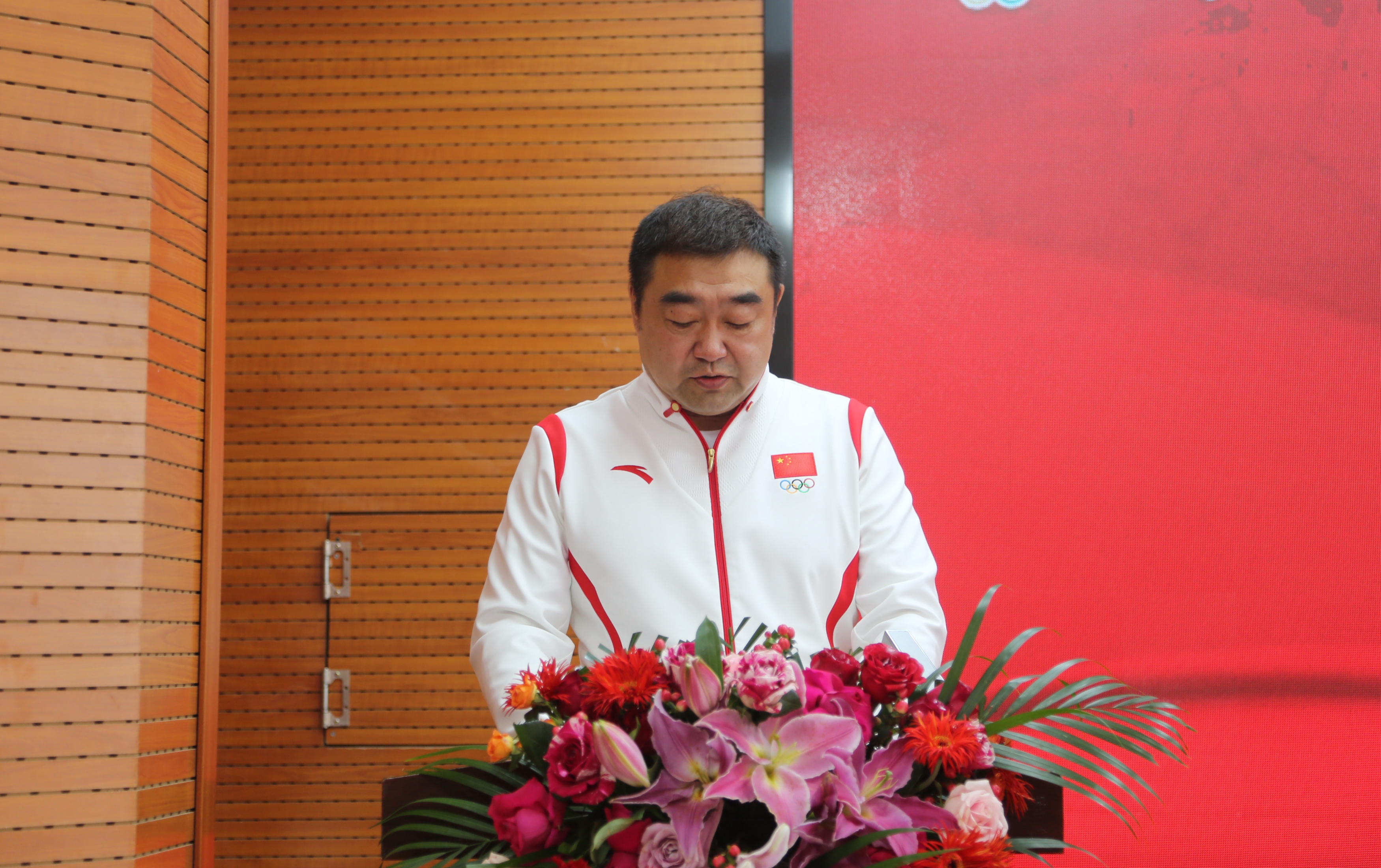 冬季奥林匹克学院专职教练员、国家短道速滑队教练员范宏文同志,代表冬奥会教练员上台发言