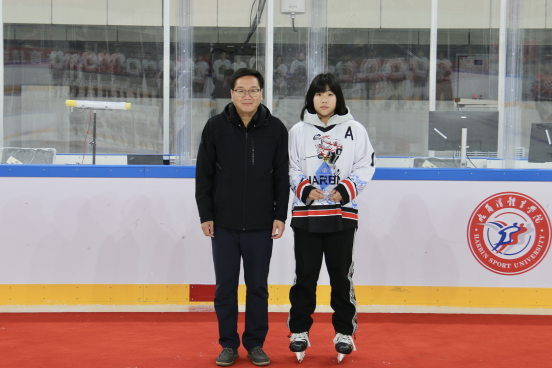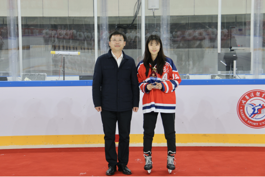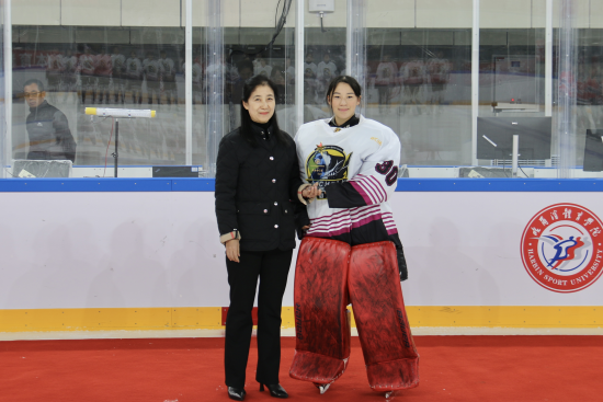 中国冰球协会竞赛部主管赵天月为本场比赛最佳运动员颁奖。