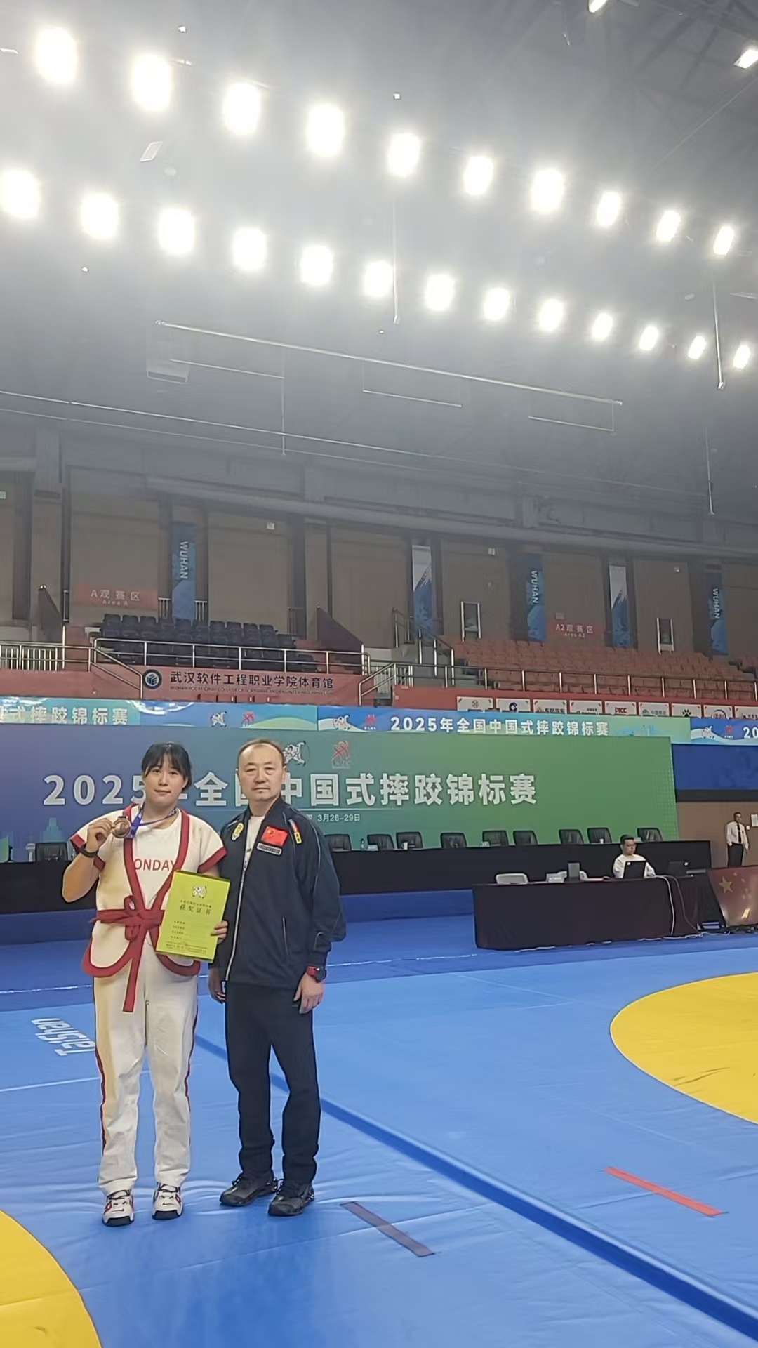 我校高度重视此次赛事,由民族传统体育学院宫照麟老师担任教练,2021级学生高宇飞为运动员。比赛中高宇飞不畏强手,充分发挥自身技术优势,一路过关斩将,最终荣获女子75公斤级铜牌,为学校争得了荣誉。