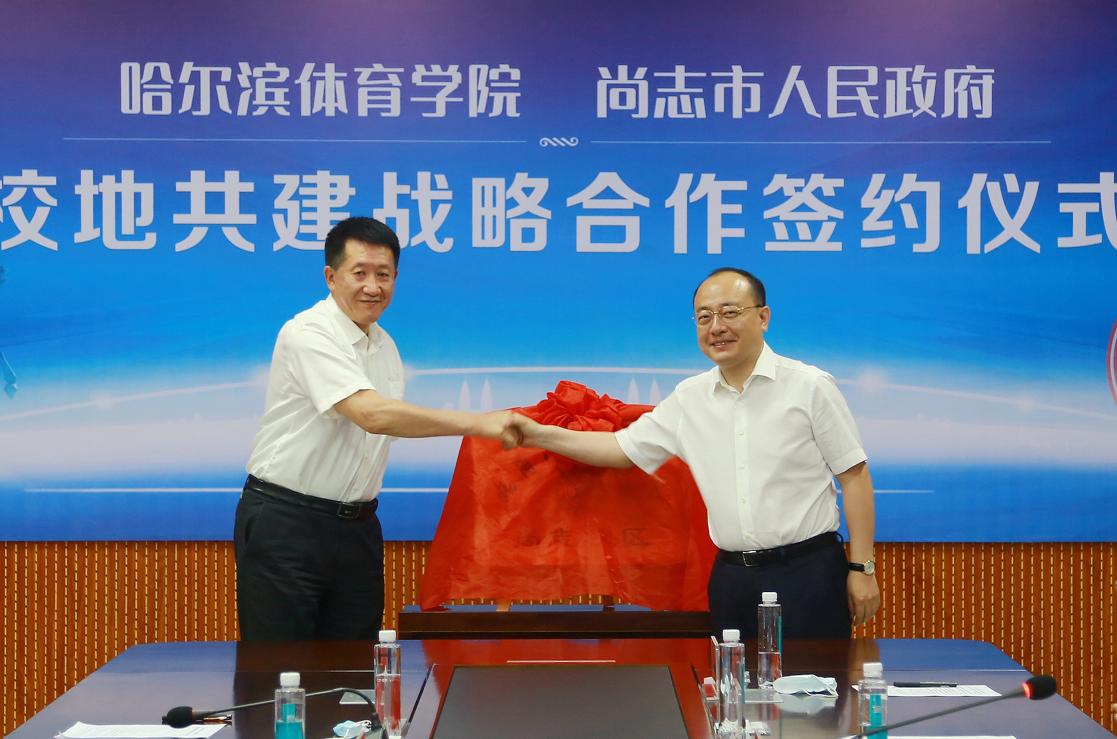 签约仪式后,兰景力与刘海涛共同为哈尔滨体育学院尚志校区揭牌。
