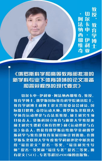 切尔卡申·伊利亚·阿法纳西耶维奇,教授,教育学博士,俄罗斯国际教育科学院通讯院士,教育学副博士和博士论文答辩委员会成员,国际散打健将,壶铃运动大师。东北联邦大学体育运动理论与方法系教授、硕士研究生项目负责人。莫斯科国立体育与旅游大学教授兼硕士研究生课程《体育管理》和《运动理论与方法》负责人。曾获得俄罗斯总统助学金和俄罗斯科学与教育部教育发展目标计划资助。在东北联邦大学年度教学科研评比中屡次获得“最佳论文”提名一等奖,“最佳研究生导师”提名一等奖和“最佳专著”提名二等奖。拥有包括论文(SCI)、专著等超过200项的出版物。