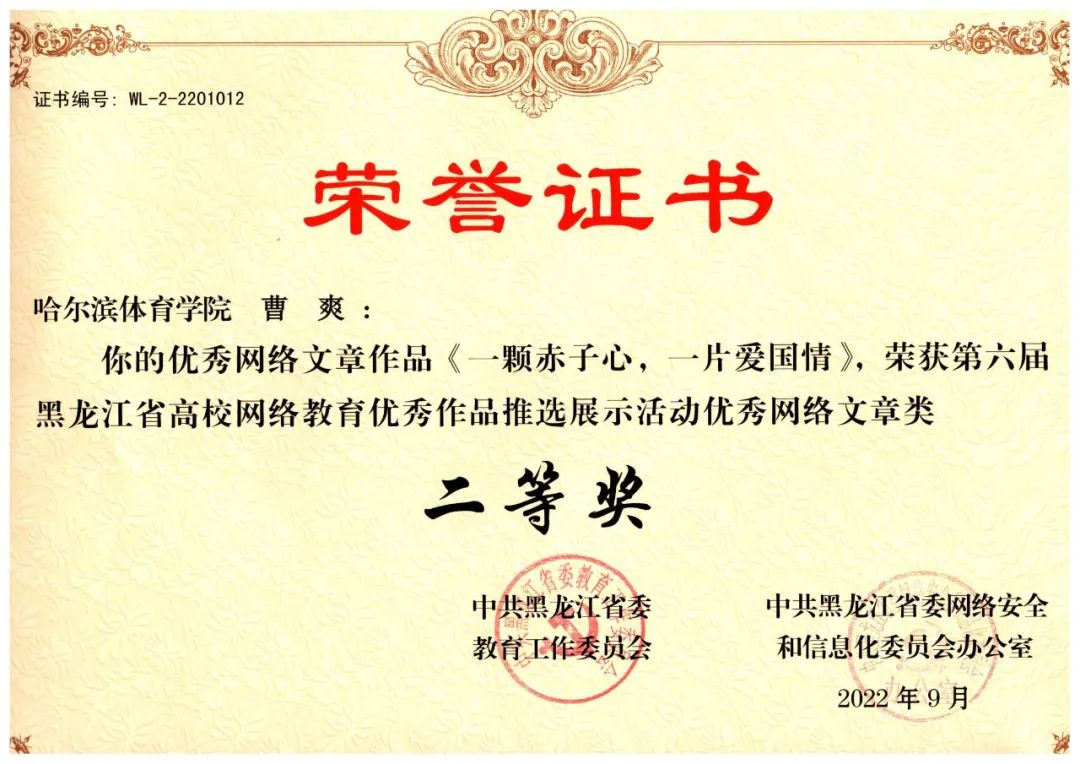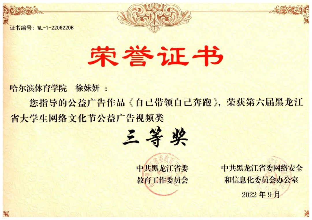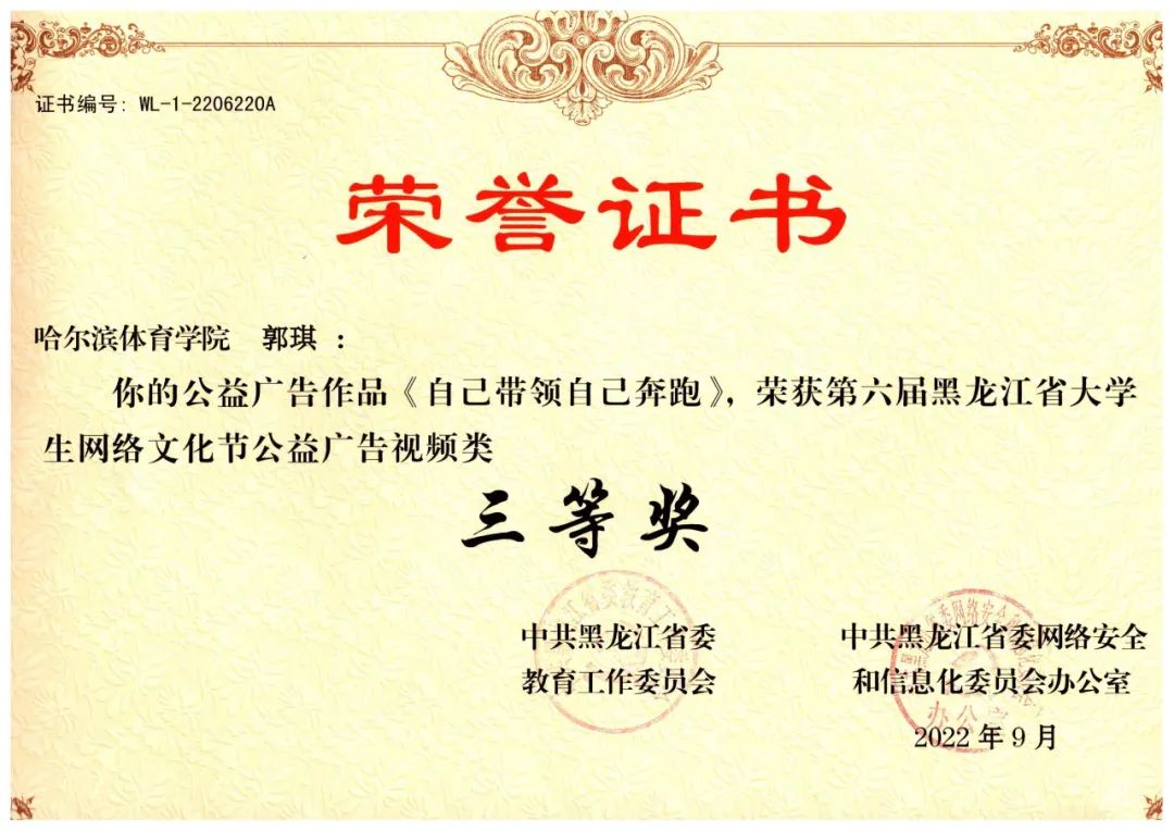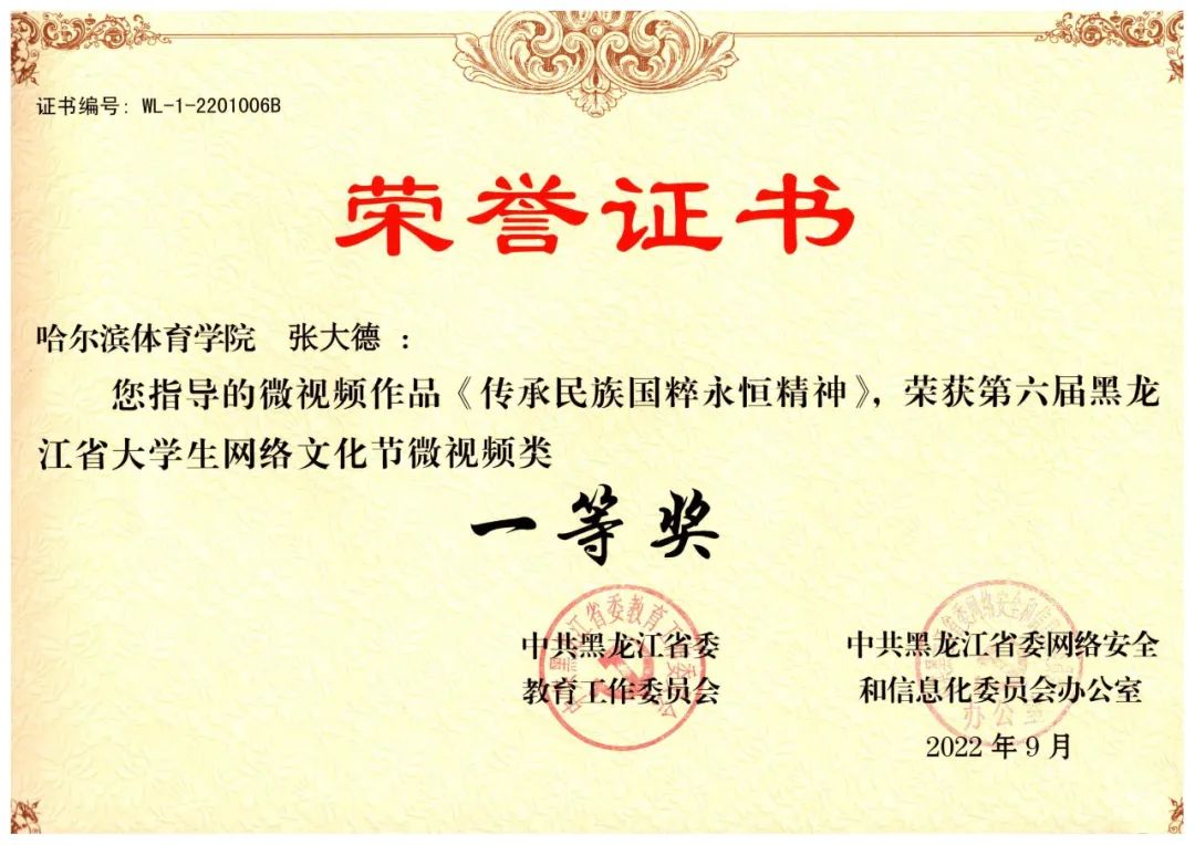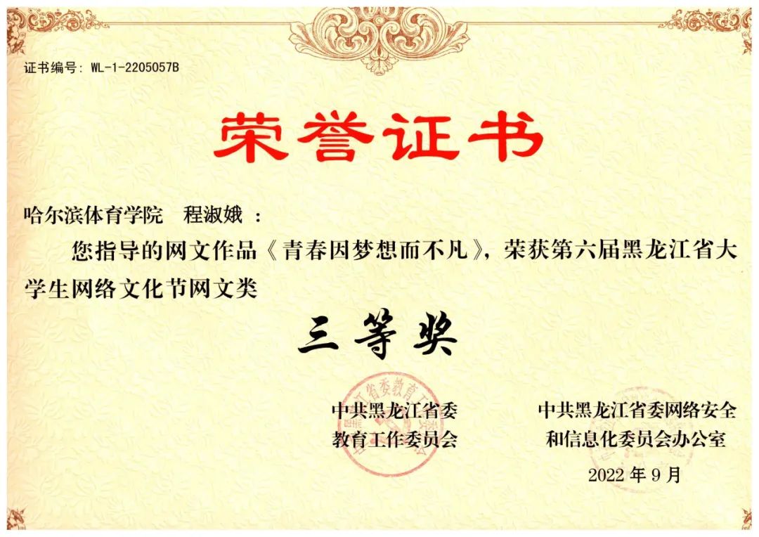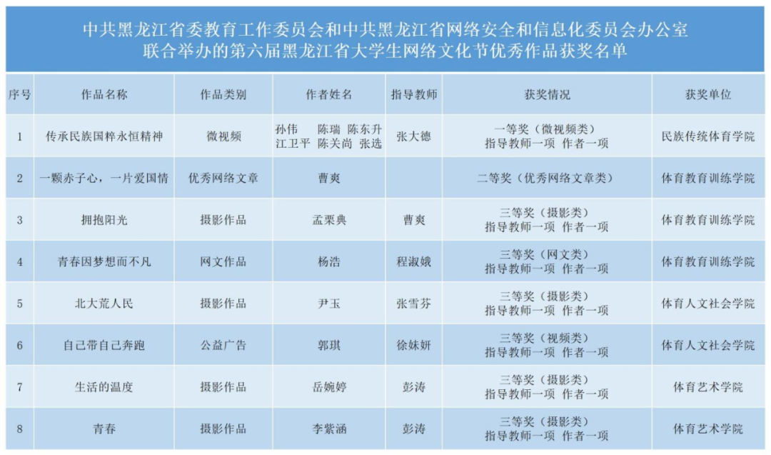 在“中共黑龙江省委教育工作委员会和中共黑龙江省网络安全和信息化委员会办公室联合举办的第六届黑龙江省大学生网络文化节”中,我校师生揽获8项等级奖: