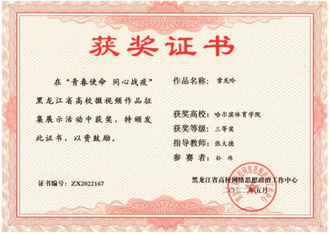在“黑龙江省高校网络思想政治工作中心‘青春使命 同心战疫’全省高校微视频作品征集展示活动”中,我校师生获得2项等级奖: