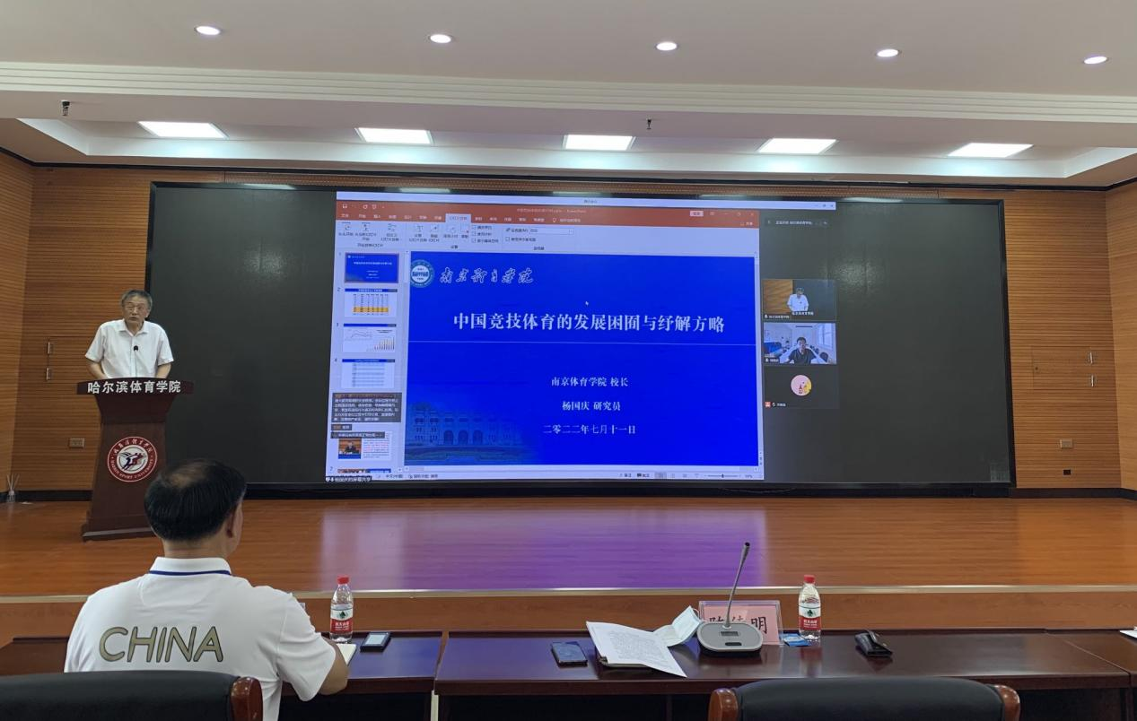 2022年7月13日下午2点,第十九期导师大讲堂在尚德楼三楼学术报告厅举行。本期大讲堂邀请的嘉宾为南京体育学院校长杨国庆。哈尔滨体育学院党委副书记、校长陈德明主持讲座,研究生院院长杜春华、教务处处长姜春平、人事处处长张显峰、教师发展中心副主任张彦秋、研究生院副院长李晓琳参加讲座。讲座采用线上线下相结合的形式展开,受到我校广大硕、博导师及研究生的热烈欢迎。