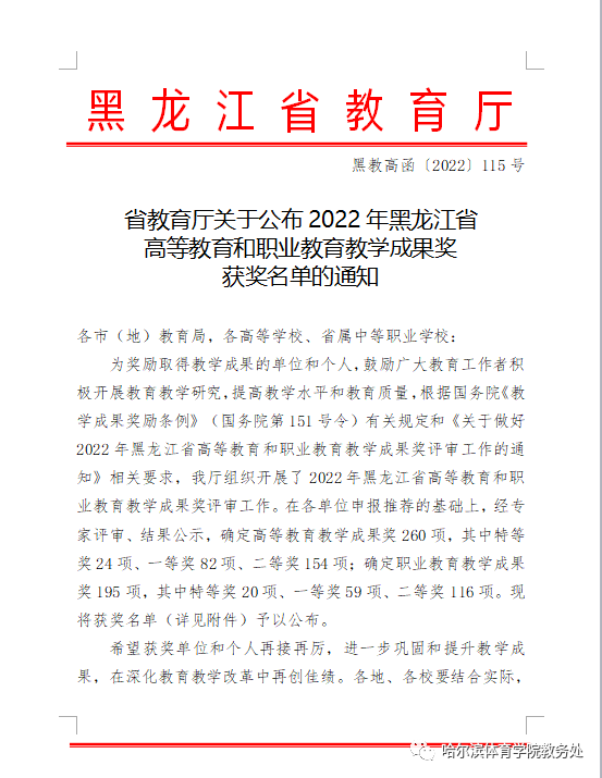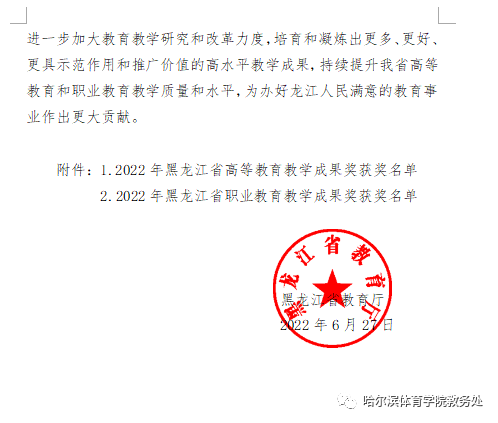 6月27日,省教育厅发布了2022年黑龙江省高等教育和职业教育教学成果奖获奖名单,我校喜获省级高等教育教学成果奖3项,其中特等奖1项、二等奖2项。获奖层次和数量创历史最好成绩,实现重大突破!