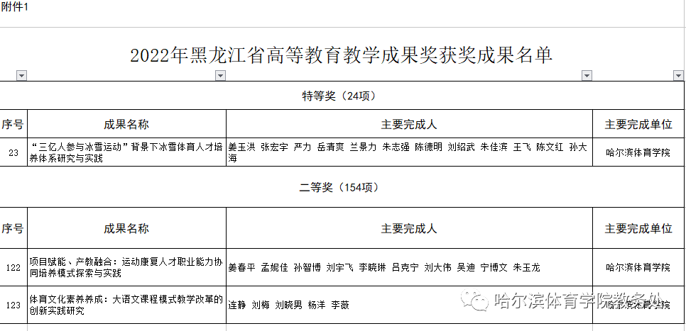 党委副书记姜玉洪团队的《"三亿人参与冰雪运动"背景下冰雪体育人才培养体系研究与实践》获得省级教学成果特等奖;教务处处长姜春平团队的《项目赋能、产教融合:运动康复人才职业能力协同培养模式探索与实践》以及大学语文教研室主任连静团队的《体育文化素养养成:大语文课程模式教学改革的创新实践研究》获得省级教学成果二等奖。此次获奖反映了我校教育教学改革发展能够取得优异成绩,是学校长期坚持以人才培养工作为中心、扎实推进教育教学改革创新结出的硕果。