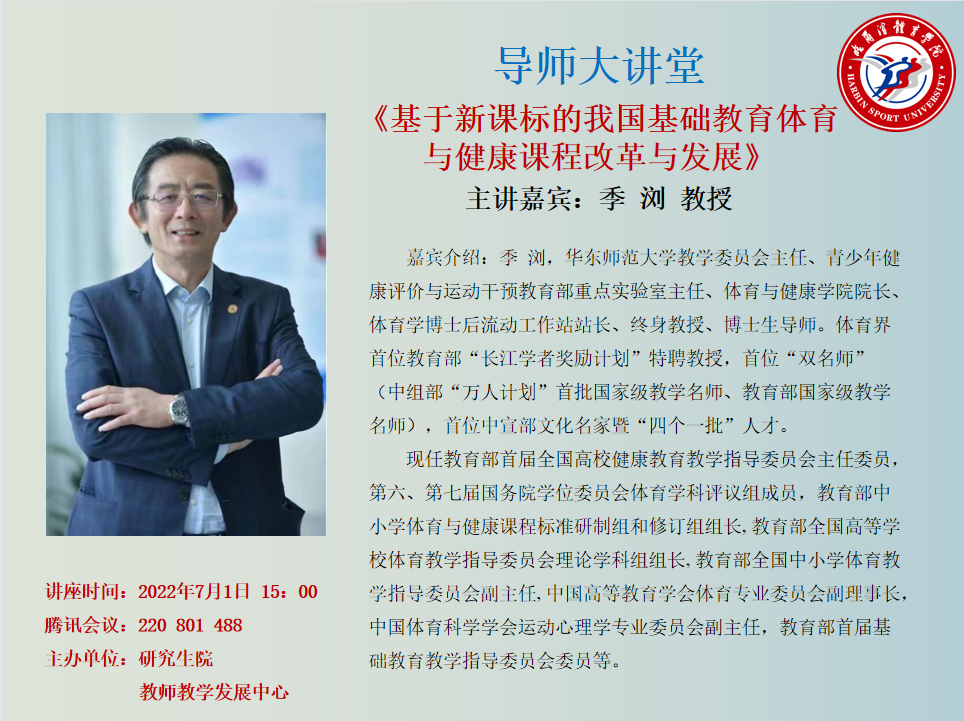 2022年7月1日下午3点,第十七期导师大讲堂在尚德楼三楼学术报告厅举行。本期大讲堂邀请的嘉宾为华东师范大学季浏教授。讲座由哈尔滨体育学院党委副书记、校长陈德明主持,同时参加讲座的领导有哈尔滨体育学院党委副书记姜玉洪、研究生院院长杜春华、教务处处长姜春平、科研处处长张宏宇、人事处处长张显峰、国际交流合作处处长刘景祥、教师发展中心副主任张彦秋、研究生院副院长李晓琳。讲座采用线上线下结合的形式展开,受到我校博士生导师、硕士生导师及广大硕博研究生的热烈欢迎。