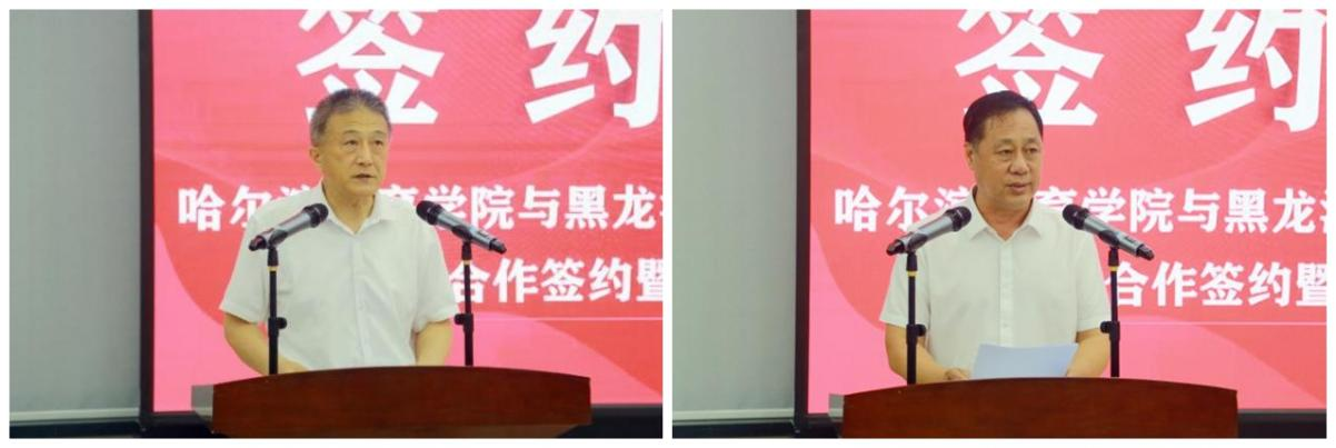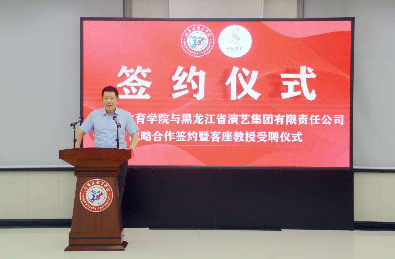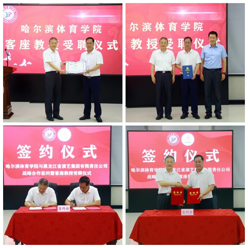 7月7日10时,哈尔滨体育学院与黑龙江省演艺集团有限责任公司举行校企战略合作框架协议签约暨客座教授受聘仪式。哈尔滨体育学院党委书记兰景力,党委副书记、校长陈德明,党委副书记姜玉洪,纪委书记那贵玲,工会主席赵俊岭,黑龙江省演艺集团有限责任公司党委书记、董事长薛金升,党委副书记、总经理刘彤,纪委书记刘迎宾,副总经理孙启军及双方相关部门负责同志出席签约及受聘仪式。兰景力书记主持签约仪式。