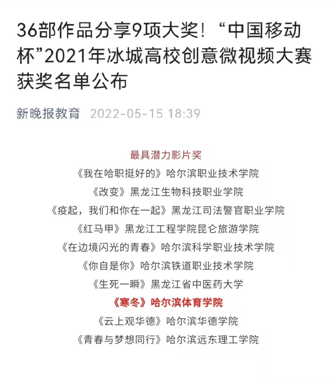 5月15日,由黑龙江省高校网络思想政治工作中心、共青团哈尔滨市委员会、哈尔滨市学生联合会、哈尔滨日报社联合主办的第三届“中国移动杯”2021冰城高校创意微视频大赛获奖名单公布。哈尔滨体育学院新闻学专业作品《寒冬》获得最具潜力影片奖。