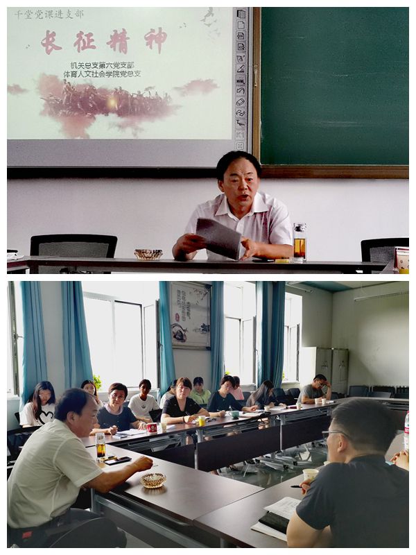 2021年7月2日下午14点,副校长刘绍武在第一教学楼四楼会议室,以长征精神为主题开展讲党课活动,机关总支第六党支部及体育人文社会学院党总支党员教师现场聆听。这是“千堂党课进支部”学习教育活动的一部分,由机关总支第六党支部书记、教务处处长姜春平主持。