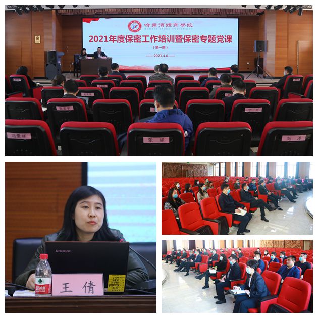 为深入学习贯彻习近平总书记关于做好保密工作的重要指示精神,牢固树立“四个意识”,推进学校保密工作标准严格、流程规范,按照省委保密办、省保密局和省委教育工委通知要求和学校保密工作领导小组安排部署,学校于4月6日14:30分在尚德楼学术报告厅举办了2021年度首期保密工作培训暨保密专题党课。本次培训邀请了黑龙江省保密局宣传法规处副处长王倩同志,以《保密管理实务》为培训主题,为学校保密工作领导小组成员、涉密重点部门全体人员、相关涉密部门(单位)主要负责人上了一堂意义深刻的特殊党课。
