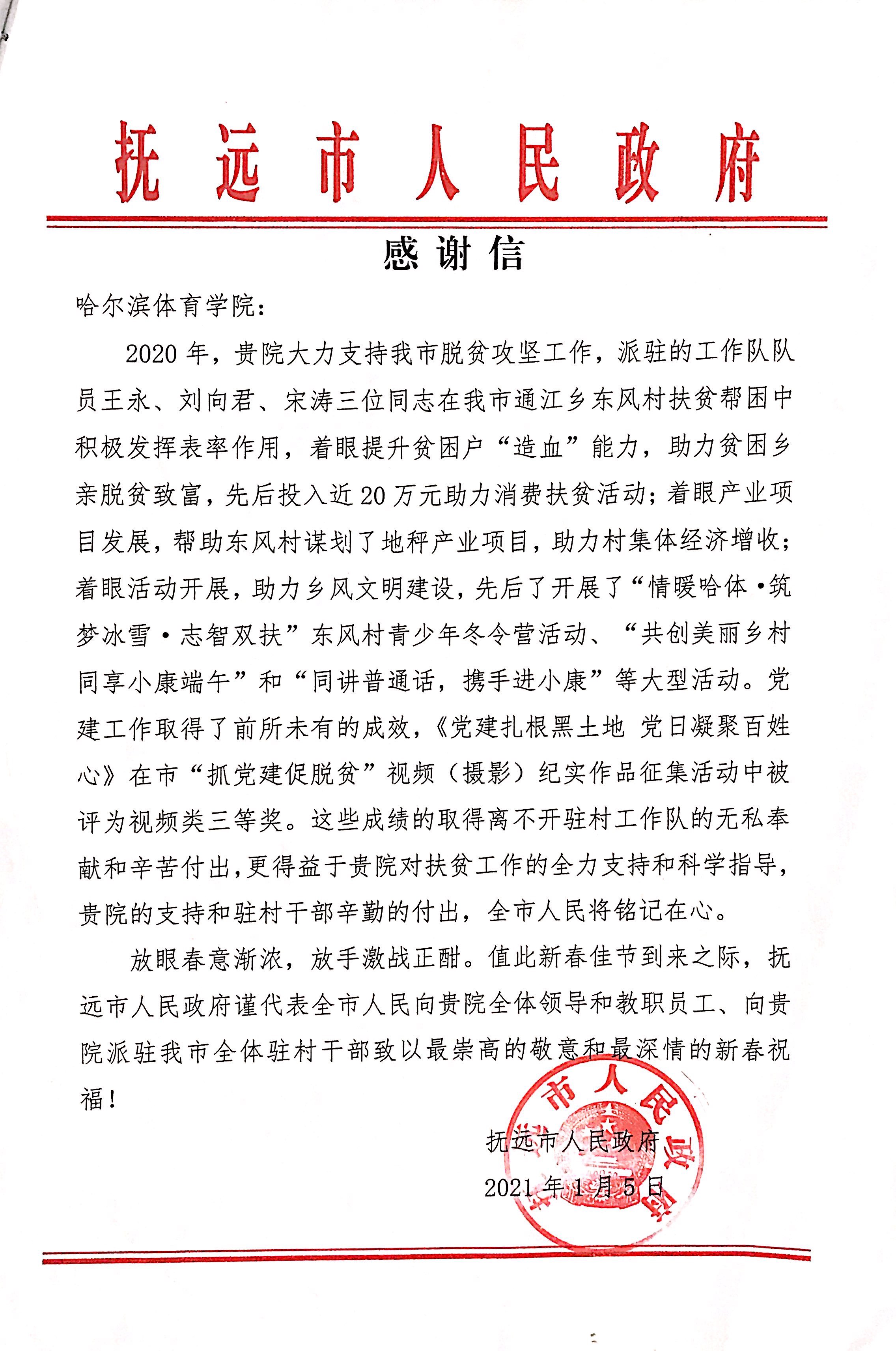 真情付出无私奉献 助力打赢脱贫攻坚战——学校收到来自抚远市人民政府的感谢信