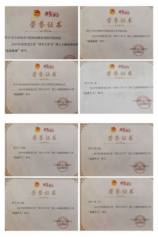 为激励广大团员、团干部和各级团组织奋发有为、再创佳绩,经过校团委联评推荐、团省委审核,体育艺术学院团委、体育教育训练学院团委、体育人文社会学院2017级团总支等三个单位被团省委授予“2019年度黑龙江省‘青年大学习’网上主题团课组织工作先进集体”荣誉称号。门光磊、杨涛、张大德、姜雪、贾士毅等五位同志被团省委授予“2019年度黑龙江省‘青年大学习’网上主题团课组织工作先进个人”荣誉称号。