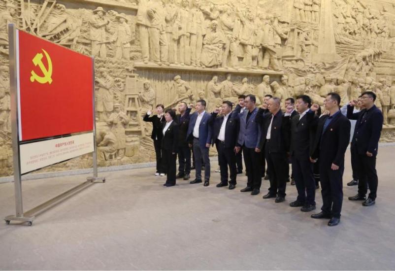 参观结束后,在大型浮雕《北大荒颂》前,同志们面对党旗一起重温入党誓词。