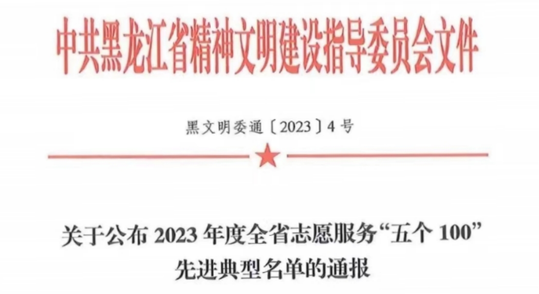 近日,黑龙江省文明办发布了2023年度全省志愿服务“五个100”先进典型名单的通报,学校青年志愿者协会成功入选,获评2023年度全省优秀志愿服务组织。