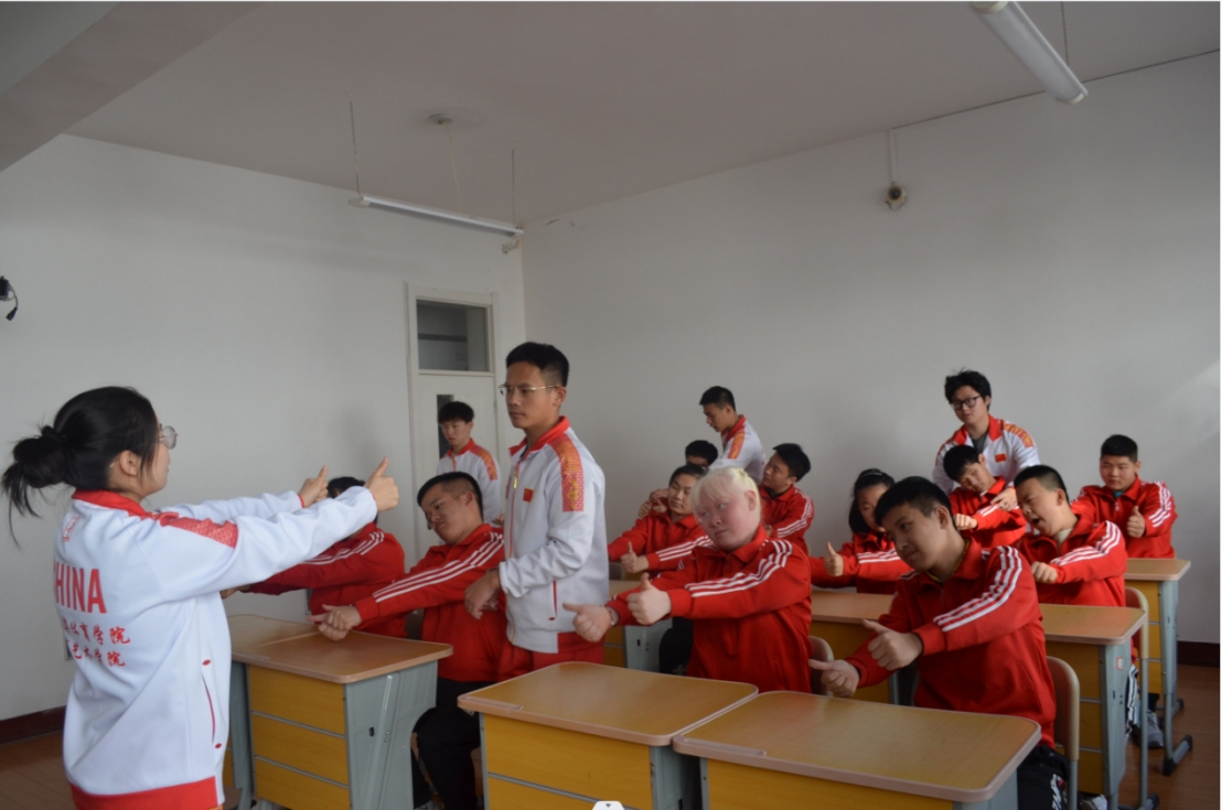 本次教学实习由体育艺术学院教工党支部书记孙涛带队,分别对该校听障部和视障部的学生开展教学实习工作。实习生们针对特殊学生不同情况的身体条件进行创编,为听障学生和视障学生各编排一套课间操,帮助他们更好地达到锻炼身体的目的。听障学生课间操为《健康动起来》;视障学生课间操为《加油!好朋友》。由于视障学生眼睛看不见,所以编排的动作主要以活动小关节动作为主;听障学生由于听力受限,设计的动作以舒展大方为主。尽管这些学生因为视力或听力的缺失,在排练过程中遇到了很多困难,但实习生们没有放弃,想方设法亲自示范,带领学生们一起练习,帮助他们用心去感受每一个动作。